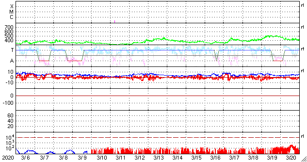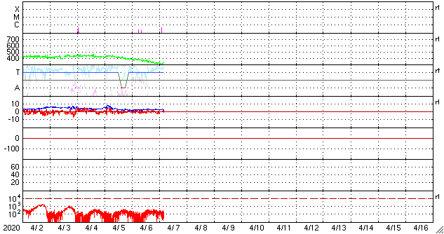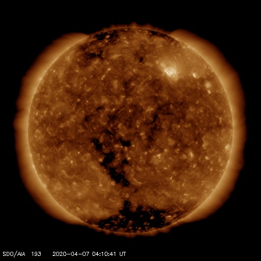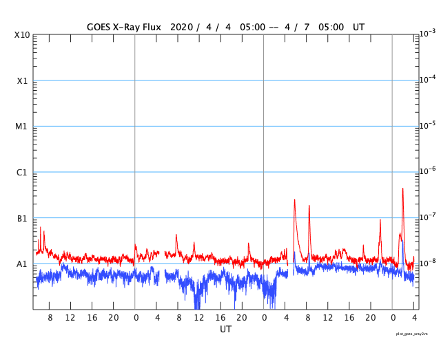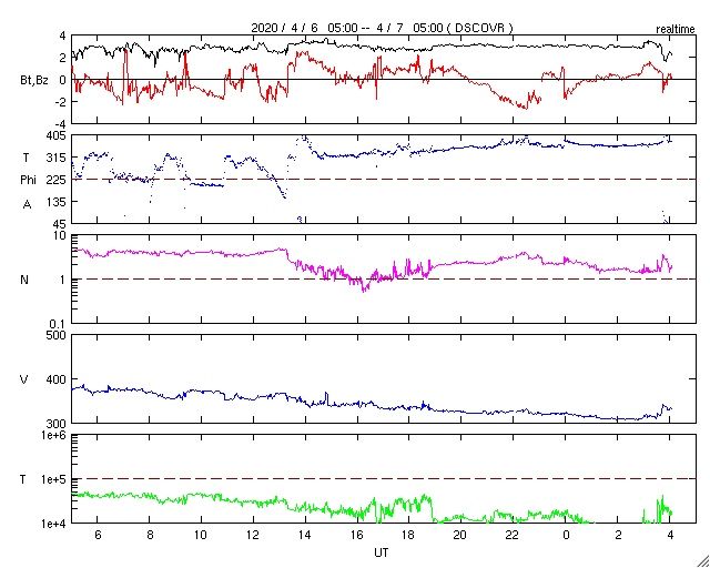 2020/ 4/ 7 13:18 更新 Bクラスの小さいフレアが続いています。太陽風は低速になっています。 担当 篠原 2759黒点群のあった領域 (SDO衛星AIA193で右上の明るく光っているところ)で、 昨日の昼過ぎから小さいフレアが続いています。 フレアの規模は、B2.5.、B1.8、B4.5です。 黒点は消えたままで、太陽は無黒点です。 太陽風は、310km/秒まで速度が下がり、 低速の風になっています。 磁場強度は、3nTとやや弱い状態です。 磁気圏も穏やかで、 AE指数はほとんど変化が起きていません。 SDO衛星AIA193では、 太陽の南半球側に縦にコロナホールが伸びています。 4日後くらいにこの領域の影響がやって来るかもしれません。 この領域は27日前には見られませんでした。 27日周期の図の前周期の太陽風とは 違う推移になる可能性があります。