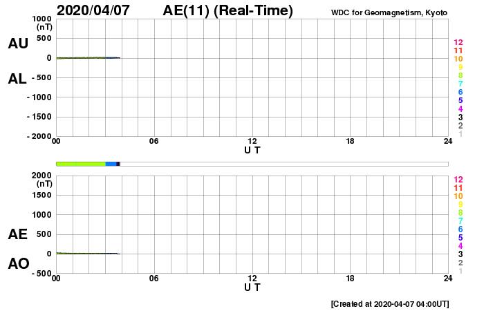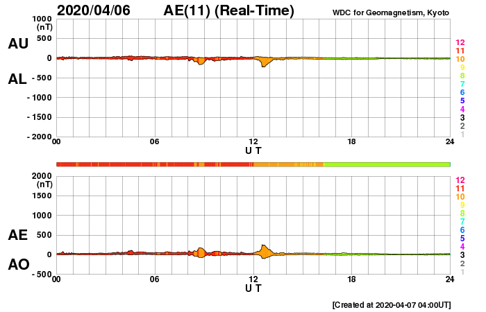 (c) SDO (NASA) ![]() SDO衛星による太陽の可視光写真 (c) SDO (NASA) ![]() GOES衛星の太陽X線強度。赤・橙 = 0.1〜0.8 nm、青・紫 = 0.05〜0.4 nm (c) データ:NOAA/SWPC、作図:宇宙天気ニュース ![]() DSCOVRが観測した太陽風の磁場(1番上の枠、黒線は全体の強度、赤線は南北成分) および、太陽風の密度(3番目の紫線)、速度(4番目の青線) (c) データ:NOAA/SWPC、作図:宇宙天気ニュース ![]() AE指数(速報値) 下段のAEグラフの値が高くなると、オーロラ活動が活発化しています。 (c) 京都大学WDC ![]() ![]() 27日の太陽周期に合わせたデータプロット 太陽が同じ面を地球に向けていた27日前の変化から、今後を予想することができます。 (c) 作図:宇宙天気ニュース