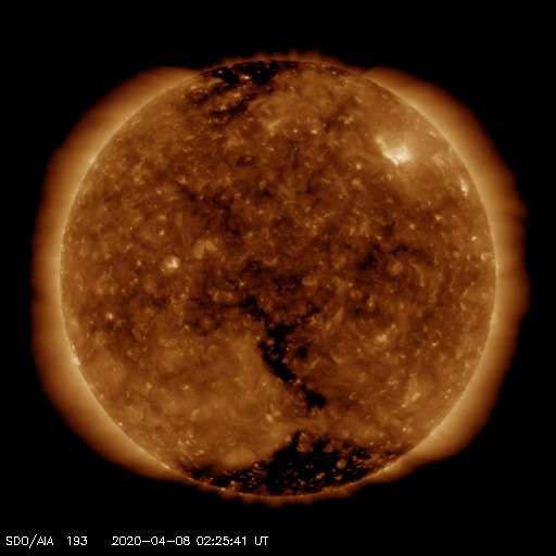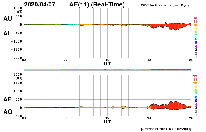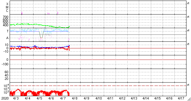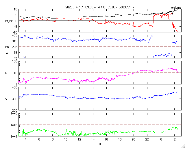 2020/ 4/ 8 11:38 更新 太陽風の磁場がやや強まっています。速度は低速です。太陽は穏やかです。 担当 篠原 今日に入った頃から太陽風の磁場強度が少しずつ高まり、 現在は、10nT近くまで強まっています。 速度は、300km/秒の低速の状態で安定していましたが、 グラフの最後で350km/秒へ少し上がっています。 まだ低速の状態です。 この後、太陽風の速度はさらに高まるかもしれません。 引き続き注目してください。 SDO衛星AIA193では、 太陽の中央部の南側にコロナホールが見えています。 3日後くらいからは、この領域の影響も始まるかもしれません。 太陽風磁場の南北成分は、磁場が強まり始めた後は、 南向きの変化が目立っています。 速度が遅いため、AE指数の変化は400nTと小規模に留まっていますが、 グラフの最後では、磁場は -10nT近くまで南向きに強まっていて、 今後、磁気圏の活動が高まる可能性があります。 太陽は、昨日のニュース以降はX線グラフの変化はなくなり、 穏やかな状態に戻っています。 黒点もありません。 ![]() SDO衛星のAIA193カメラによる太陽コロナの様子 (c) SDO (NASA) ![]() SDO衛星による太陽の可視光写真 (c) SDO (NASA) ![]() DSCOVRが観測した太陽風の磁場(1番上の枠、黒線は全体の強度、赤線は南北成分) および、太陽風の密度(3番目の紫線)、速度(4番目の青線) (c) データ:NOAA/SWPC、作図:宇宙天気ニュース ![]() AE指数(速報値) 下段のAEグラフの値が高くなると、オーロラ活動が活発化しています。 (c) 京都大学WDC ![]() ![]() 27日の太陽周期に合わせたデータプロット 太陽が同じ面を地球に向けていた27日前の変化から、今後を予想することができます。 (c) 作図:宇宙天気ニュース