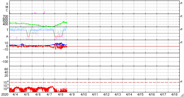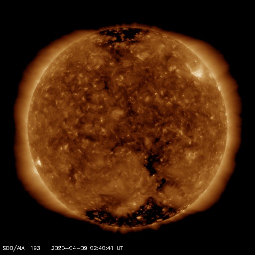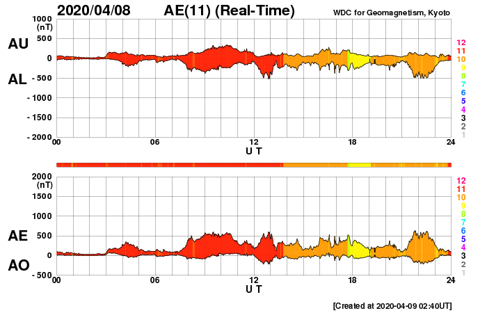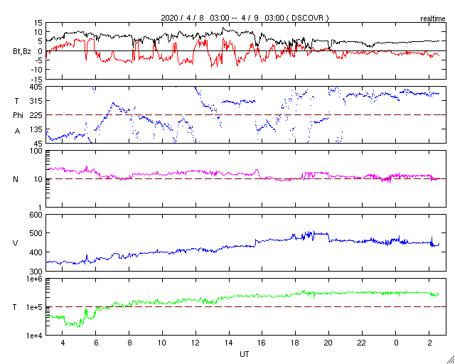 2020/ 4/ 9 11:50 更新 太陽風はやや高速になっています。磁気圏の活動もやや高まりました。 担当 篠原 昨日のニュース以降も太陽風の速度はゆっくりと上昇して、 今朝早くに500km/秒に達しました。 その後は一段下がって、現在は450km/秒とやや高速の状態です。 磁場強度は、速度が上昇している頃は 10nT程度に高まっていましたが、 最高速度に達する少し前に下がり始め、 現在は5nTと平均的な値に戻っています。 磁場が強まっていた頃、 南北成分は南を向いたり、北を向いたり 変化を繰り返していました。 この影響で磁気圏の活動もやや高まった状態が続き、 AE指数は500nTの変化が半日ほど続いています。 太陽風のグラフの後半では、 南北成分は変化が小さくなっています。 このため、磁気圏の活動も現在は落ち着いていて、 AE指数の変化は見られなくなっています。 太陽風の高まりは、この後どの様に推移するでしょうか。 SDO衛星AIA193で南半球に見えている コロナホールの影響にも注目してください。 太陽は無黒点です。 南東の端近く(左下)に小さい活動的な領域が発生して、 SDO衛星AIA193で明るく光っています。 更に発達するでしょうか。 ![]() SDO衛星のAIA193カメラによる太陽コロナの様子 (c) SDO (NASA) ![]() SDO衛星による太陽の可視光写真 (c) SDO (NASA) ![]() DSCOVRが観測した太陽風の磁場(1番上の枠、黒線は全体の強度、赤線は南北成分) および、太陽風の密度(3番目の紫線)、速度(4番目の青線) (c) データ:NOAA/SWPC、作図:宇宙天気ニュース ![]() AE指数(速報値) 下段のAEグラフの値が高くなると、オーロラ活動が活発化しています。 (c) 京都大学WDC ![]() ![]() 27日の太陽周期に合わせたデータプロット 太陽が同じ面を地球に向けていた27日前の変化から、今後を予想することができます。 (c) 作図:宇宙天気ニュース