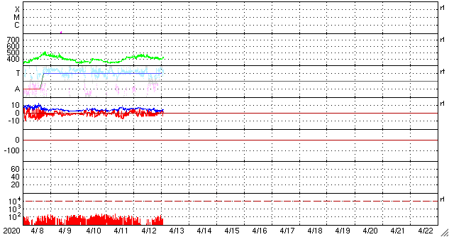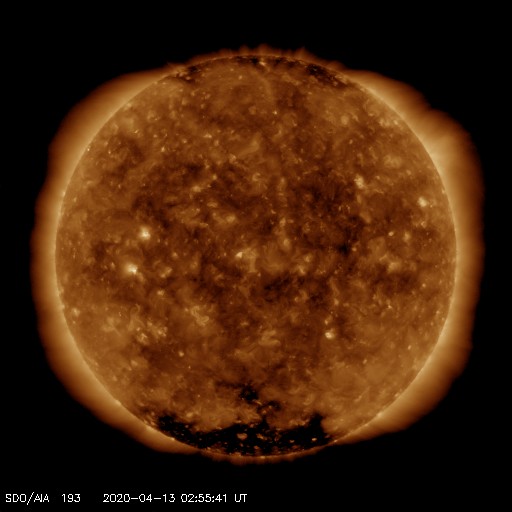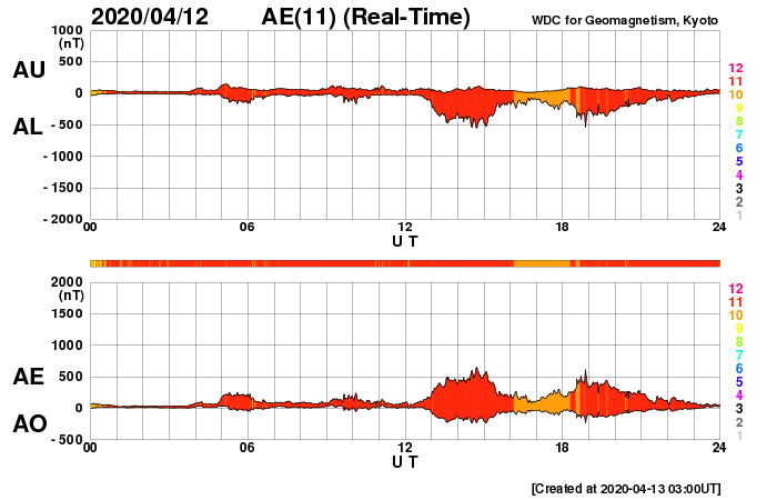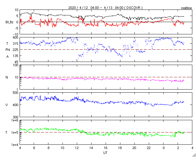 2020/ 4/13 12:06 更新 太陽風は平均的な状態です。磁気圏の活動がやや高まりました。 担当 篠原 太陽風の速度は、 450km/秒から400km/秒へ少し下がっていますが、 平均的な状態が続いています。 磁場強度も、5nT前後で平均的な状態です。 磁場の南北成分は、 グラフの中盤で弱い南寄りになっています。 磁気圏の活動も少し高まって、 AE指数では500nTの中規模の変化がしばらく続いています。 グラフの後半は、磁場は0nT付近で小さくなっています。 AE指数の変化もなくなり、磁気圏は穏やかです。 27日周期の図を見ると、前周期の太陽風は、 この後、400km/秒台から500km/秒台へ次第に高まっています。 今回はどの様な推移になるでしょうか。 太陽は無黒点で穏やかです。 東側(左側)の赤道近くに、小さい磁場の強まりが2箇所発生しています。 SDO衛星AIA193でも、明るい点として見えています。 更に強まって、黒点が発生したりするでしょうか。 ![]() SDO衛星のAIA193カメラによる太陽コロナの様子 (c) SDO (NASA) ![]() SDO衛星による太陽の可視光写真 (c) SDO (NASA) ![]() DSCOVRが観測した太陽風の磁場(1番上の枠、黒線は全体の強度、赤線は南北成分) および、太陽風の密度(3番目の紫線)、速度(4番目の青線) (c) データ:NOAA/SWPC、作図:宇宙天気ニュース ![]() AE指数(速報値) 下段のAEグラフの値が高くなると、オーロラ活動が活発化しています。 (c) 京都大学WDC ![]() ![]() 27日の太陽周期に合わせたデータプロット 太陽が同じ面を地球に向けていた27日前の変化から、今後を予想することができます。 (c) 作図:宇宙天気ニュース