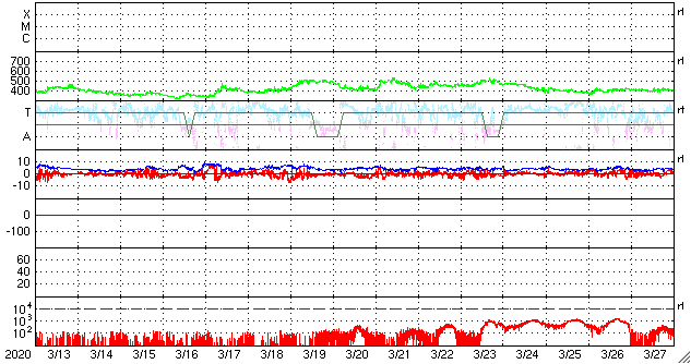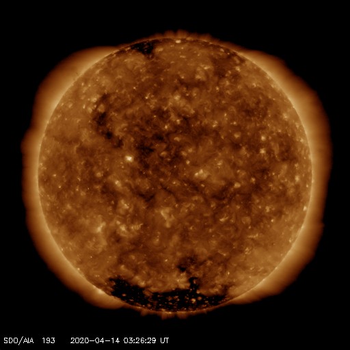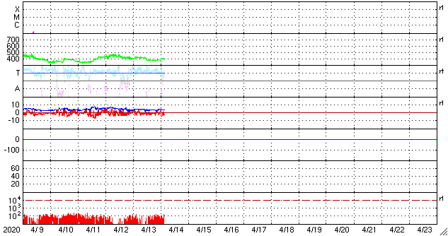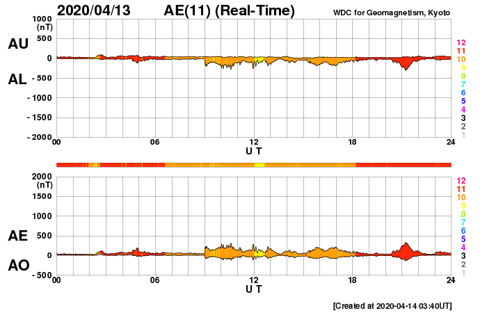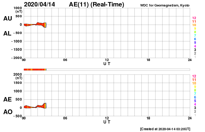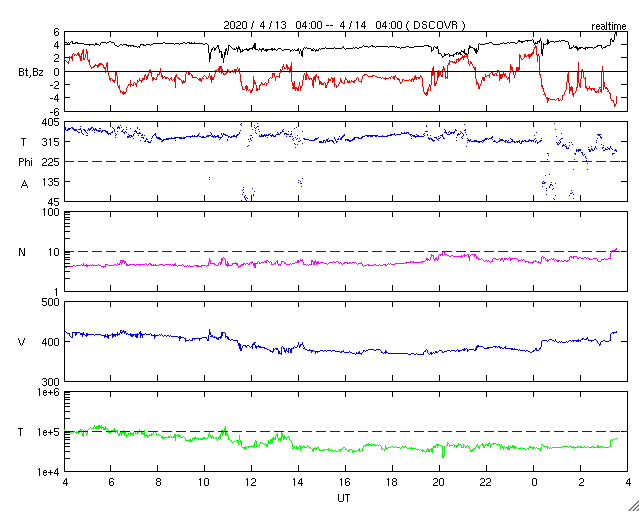 2020/ 4/14 12:46 更新 太陽風は平均的な速度で安定しています。太陽は無黒点が続いています。 担当 篠原 太陽風の速度は、 400km/秒前後と平均的な状態が続いています。 磁場強度も3〜4nTとやや弱い状態で安定しています。 磁場の南北成分は、弱い南寄りになっていて、 AE指数は小さい変化が頻繁に発生しています。 太陽風のグラフの最後付近で、 南向きの磁場がやや強まっています。 この後、AE指数の変化もやや大きくなるかもしれません。 SDO衛星AIA193では、 太陽の中央部にコロナホールは見られず、 太陽風は穏やかに推移しそうです。 一方、27日周期の図の前周期の太陽風は、 この後、500km/秒程度の高まりになっています。 今回はどの様な変化になるでしょうか。 太陽は無黒点です。 X線のグラフも静かな状態です。 ![]() SDO衛星のAIA193カメラによる太陽コロナの様子 (c) SDO (NASA) ![]() SDO衛星による太陽の可視光写真 (c) SDO (NASA) ![]() DSCOVRが観測した太陽風の磁場(1番上の枠、黒線は全体の強度、赤線は南北成分) および、太陽風の密度(3番目の紫線)、速度(4番目の青線) (c) データ:NOAA/SWPC、作図:宇宙天気ニュース ![]() AE指数(速報値) 下段のAEグラフの値が高くなると、オーロラ活動が活発化しています。 (c) 京都大学WDC ![]() ![]() 27日の太陽周期に合わせたデータプロット 太陽が同じ面を地球に向けていた27日前の変化から、今後を予想することができます。 (c) 作図:宇宙天気ニュース