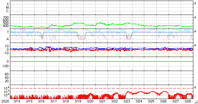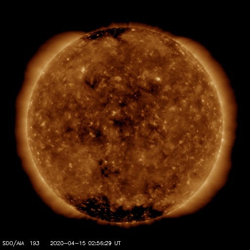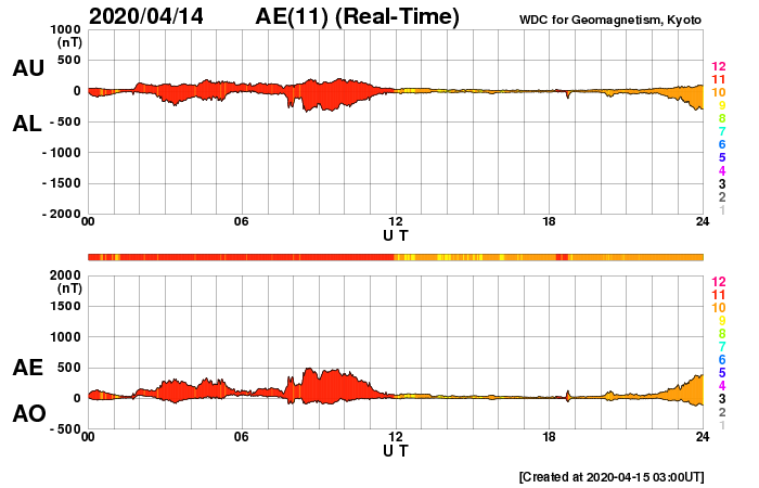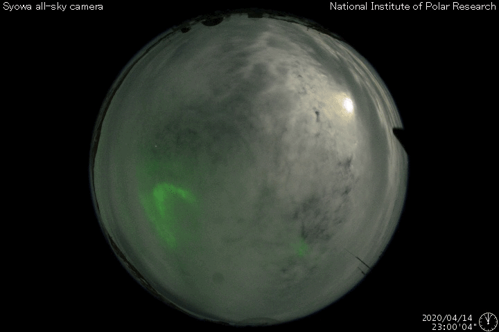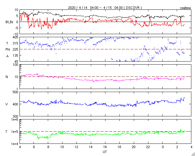 2020/ 4/15 12:15 更新 太陽風は平均的な状態です。磁気圏はやや活動的です。 担当 篠原 太陽風の速度は、 400〜420km/秒と平均的な状態で安定しています。 磁場強度も、4〜5nTと平均的な状態です。 磁場の南北成分は、 グラフの初めと終わりに南寄りの変化をしています。 このため、AE指数のグラフも、 500nTの変化が起きて、一旦静かになり、 再び600nTの活動が起きるという推移になっています。 後半の活動の高まりの頃のオーロラの様子を、 南極・昭和基地の全天カメラの動画で紹介します。 薄雲がかかっていて、空の条件は厳しいですが、 オーロラの活発な動きを見ることができます。 太陽風磁場の南寄りの傾向は続いているので、 この後も磁気圏の活動は続く可能性があります。 27日周期の図では、 前周期の太陽風はこれから500km/秒の高速風に変わっています。 今回はどのような変化になるか、注目してください。 太陽は、無黒点で穏やかです。