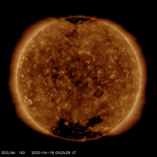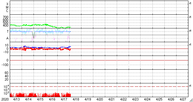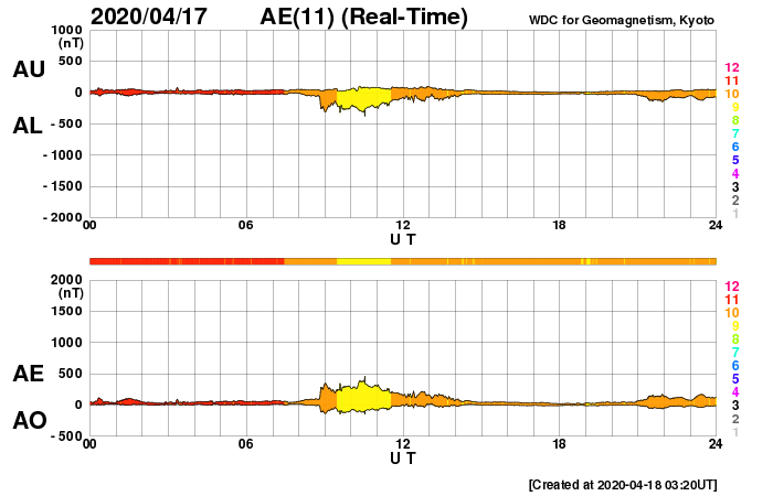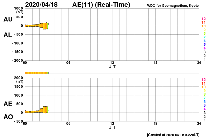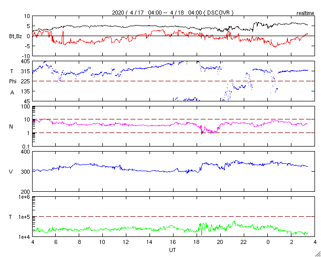 2020/ 4/18 12:37 更新 低速の太陽風が続いています。 担当 篠原 太陽風は、300〜340km/秒の低速の風が続いています。 磁場強度は、4〜5nTと平均的な状態です。 磁場の南北成分は、 グラフの初めと終わりで弱い南寄りになっています。 この影響で、AE指数に300nT程度の 小規模の変化が発生しています。 グラフの最後では、南北成分は0nT付近に戻っています。 このままであれば、磁気圏は穏やかになるでしょう。 SDO衛星AIA193では、 南極から縦に伸びるコロナホールが目立つ程度です。 太陽風は穏やかに推移しそうです。 太陽は無黒点で、穏やかです。 SDO衛星AIA193では、 明るく光る領域も見られません。 ![]() SDO衛星のAIA193カメラによる太陽コロナの様子 (c) SDO (NASA) ![]() SDO衛星による太陽の可視光写真 (c) SDO (NASA) ![]() DSCOVRが観測した太陽風の磁場(1番上の枠、黒線は全体の強度、赤線は南北成分) および、太陽風の密度(3番目の紫線)、速度(4番目の青線) (c) データ:NOAA/SWPC、作図:宇宙天気ニュース ![]() AE指数(速報値) 下段のAEグラフの値が高くなると、オーロラ活動が活発化しています。 (c) 京都大学WDC ![]() ![]() 27日の太陽周期に合わせたデータプロット 太陽が同じ面を地球に向けていた27日前の変化から、今後を予想することができます。 (c) 作図:宇宙天気ニュース