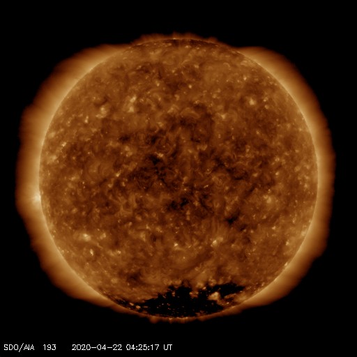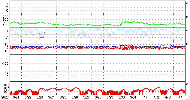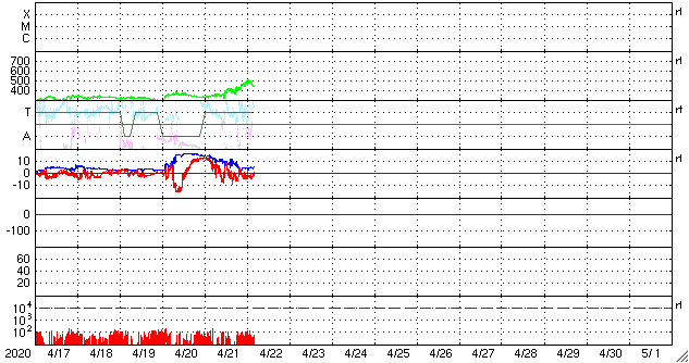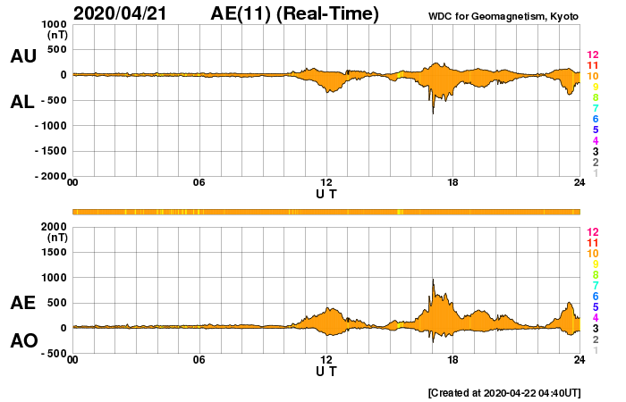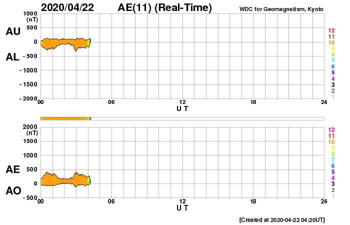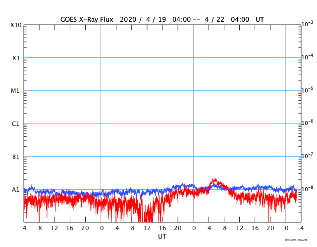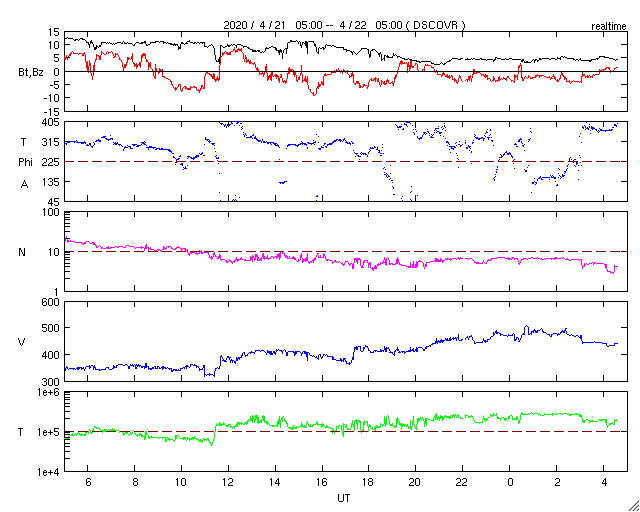 2020/ 4/22 13:43 更新 太陽風がやや高速になり、磁気圏の活動もやや高まっています。 担当 篠原 太陽風の速度は、昨夜から少しずつ上昇して、 今朝くらいに一時的に500km/秒まで高まりました。 現在は少し下がって、440km/秒と平均的な状態に戻りかけています。 磁場強度は、昨日の強まりからゆっくりと低下して、 現在は4〜5nTと平均的な値に戻っています。 磁場の南北成分は、南寄りで推移しています。 速度がやや高まったこともあり、 磁気圏の活動もある程度高まって、 AE指数は500nT前後の中規模の変化が続いています。 SDO衛星AIA193では、 太陽の低緯度域にコロナホールは見られず、 太陽風の速度が更に大きく高まることはないように思います。 太陽は無黒点が続いています。 X線グラフも特に変化はありません。
