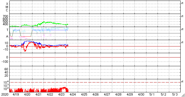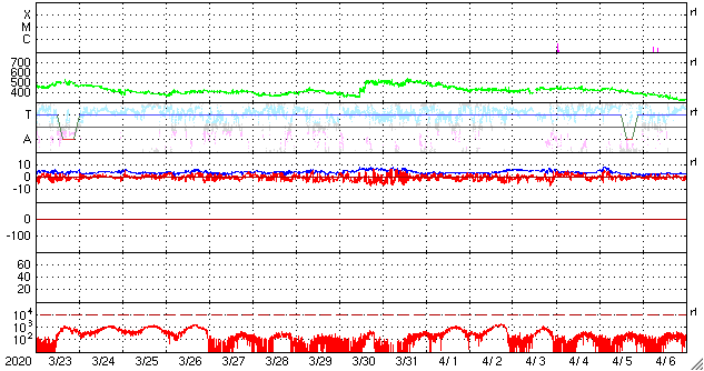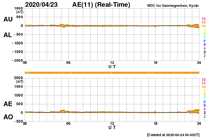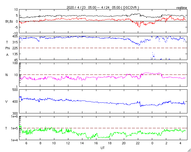 2020/ 4/24 13:53 更新 太陽風はやや低速です。ムルマンスクのオーロラをどうぞ。 担当 篠原 ロシア・ムルマンスクの福島留美さんからいただいた、 3月のオーロラ写真を紹介します。 1、2枚目の写真は、太陽風が400km/秒と平均的な状態で、 AE指数の変化も小規模だった頃、 3、4枚目は、太陽風が500km/秒に高まり、 AE指数も500nTを超えて中規模の変化が起きていた頃の撮影です。 1枚目の写真はとても綺麗な光景ですが、 明るく光っているのが何かは分かりませんでした。 2枚目の地平線近くの明るいものは細くなった月、その右上は金星です。 3、4枚目は、同じ夜に違う場所での様です。 地上の景色がいいですね。 現在の太陽風は、速度が380km/秒とやや低速になっています。 磁場強度は5nTと平均的な値です。 磁場の南北成分は、弱い北寄りになっています。 磁気圏は穏やかで、AE指数はほとんど変化のない状態です。 SDO衛星AIA193では、太陽の中心部にコロナホールはなく、 穏やかな太陽風が続きそうです。 SDO衛星AIA193では、東端の赤道近くに明るい点が見えています。 小さい磁場の強まりができていて、 可視光写真を拡大すると、 とても小さい黒点ができている様に見えます。 この後、どの様に変化するでしょうか。 X線グラフにAクラスの小さい変化が起きていますが、 この領域で発生した現象です。 その他に活動的な領域はなく、太陽は穏やかです。 ![]() 3月17日にロシア・ムルマンスク州で撮影されたオーロラ。 (c) 福島留美氏、トリフォノワ・L氏 ![]() 3月28日にロシア・ムルマンスク州で撮影されたオーロラ。 (c) 福島留美氏、オナツキー・V氏 ![]() 3月30日にロシア・ムルマンスク州のアパチット市で撮影されたオーロラ。 (c) 福島留美氏、ジガーノフ・V氏 ![]() 3月30日にロシア・ムルマンスク州で撮影されたオーロラ。 (c) 福島留美氏、オスキナ・E氏 ![]() SDO衛星のAIA193カメラによる太陽コロナの様子 (c) SDO (NASA) ![]() SDO衛星による太陽の可視光写真 (c) SDO (NASA) ![]() DSCOVRが観測した太陽風の磁場(1番上の枠、黒線は全体の強度、赤線は南北成分) および、太陽風の密度(3番目の紫線)、速度(4番目の青線) (c) データ:NOAA/SWPC、作図:宇宙天気ニュース ![]() AE指数(速報値) 下段のAEグラフの値が高くなると、オーロラ活動が活発化しています。 (c) 京都大学WDC ![]() ![]() 27日の太陽周期に合わせたデータプロット 太陽が同じ面を地球に向けていた27日前の変化から、今後を予想することができます。 (c) 作図:宇宙天気ニュース