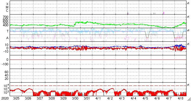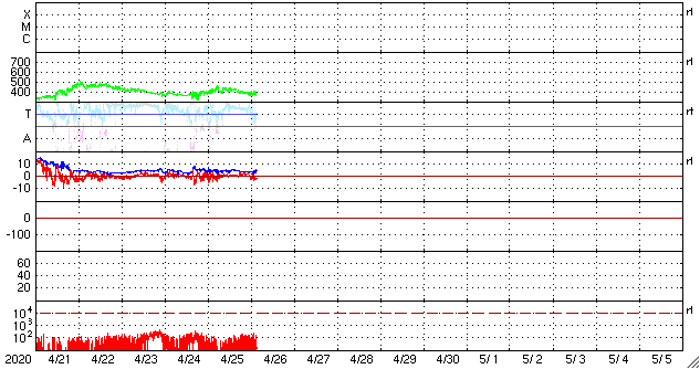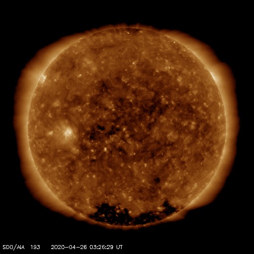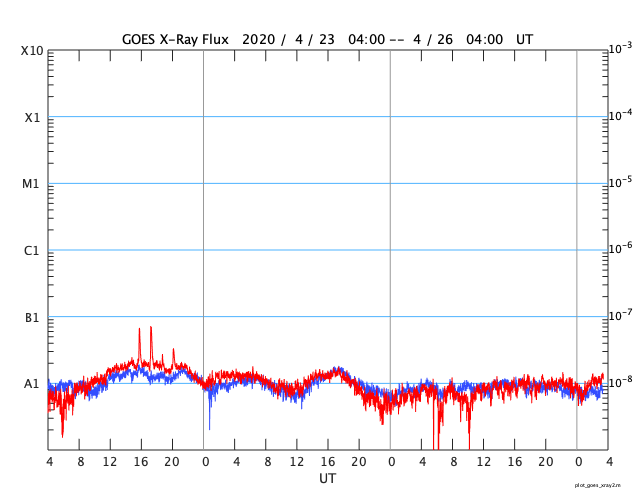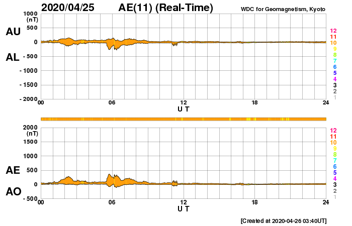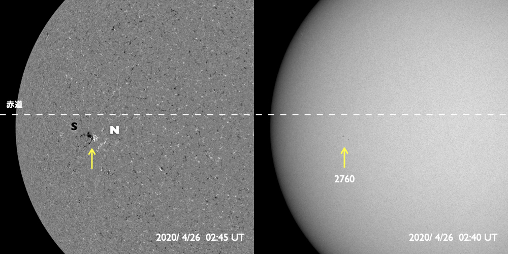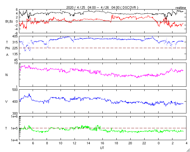 2020/ 4/26 12:44 更新 黒点に2760群と番号が付けられました。太陽風は平均的な状態です。 担当 篠原 昨日の昼に太陽の東側に見え始めた小さい黒点は、 2760群と番号が付けられました。 位置は南緯7度と赤道に近く、 磁場は左にS極、右にN極と並んでいて、 現在の第24活動周期の黒点の様です。 NOAAの報告書で新しく群番号が付けられたのは、 4月1日以来で、25日ぶりです。 X線グラフに特に変化はなく、活動は穏やかです。 また、SDO衛星AIA193では、 北東(左上)の端から明るく光る領域がこちら側に回ってきましたが、 今のところ黒点は見えない様です。 太陽風は、速度が420km/秒から380km/秒へ下がり気味です。 磁場強度は、4nT前後と平均的な状態です。 磁気圏は穏やかで、AE指数は特に変化のない状態です。 SDO衛星AIA193では、低緯度域にコロナホールは見られず、 太陽風は穏やかな状態が続きそうです。