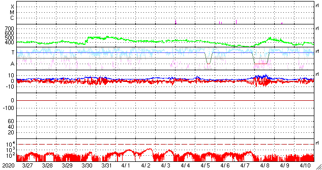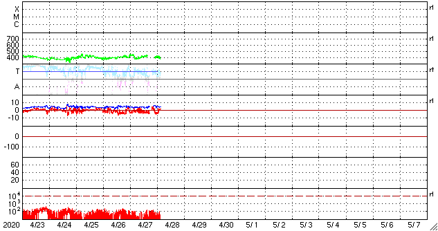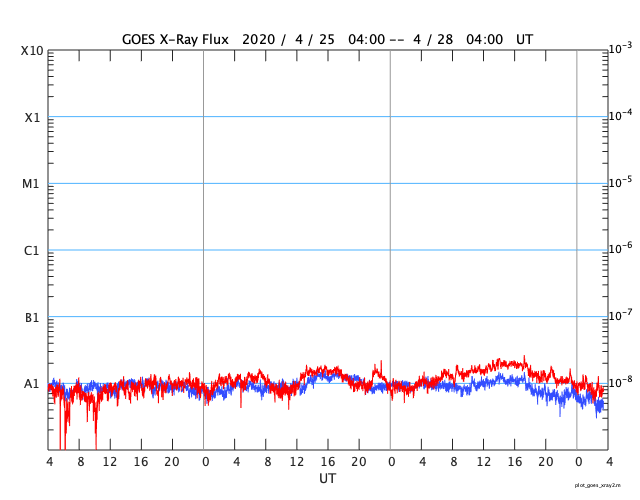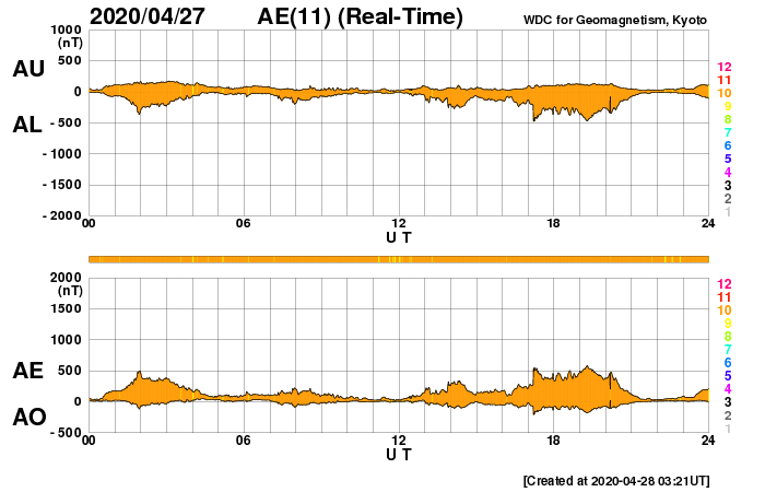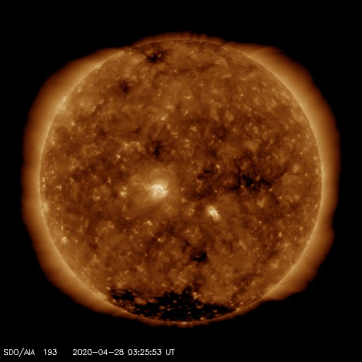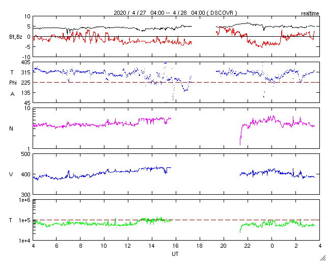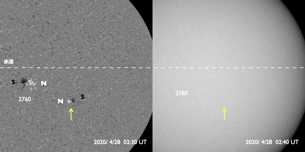 2020/ 4/28 12:41 更新 新しい黒点が発生しています。太陽風は平均的な状態です。 担当 篠原 昨日のニュースのすぐ後に、 2760黒点群の右下の領域に新しい黒点が発生しました。 夕方にかけて大きくなり、その後は次第に小さくなっていますが、 現在の可視光写真でも見ることができます。 磁場の並びは、2760群とは逆で、南半球の第25期の順番です。 現れた位置は南緯18度くらいです。 今朝のNOAAの報告書では、群番号は付けられていませんでした。 この後、番号が付けられるでしょうか。 一方、2760群は昨日よりも小さくなっています。 このまま消えてしまうかもしれません。 X線グラフに特に変化はなく、活動は穏やかです。 太陽風は、速度は400km/秒前後、磁場強度は5nTと、 どちらも平均的な状態が続いています。 磁場の南北成分は、弱い南寄りで、 AE指数は500nT程度の中規模の変化が度々発生しています。 SDO衛星AIA193では、低緯度域にコロナホールは見られず、 この後も穏やかな太陽風が続きそうです。 ![]() 2760黒点群の右側に黒点が発生しました。SDO衛星による磁場と可視光の写真。 (c) SDO (NASA)、作図:宇宙天気ニュース ![]() SDO衛星のAIA193カメラによる太陽コロナの様子 (c) SDO (NASA) ![]() SDO衛星による太陽の可視光写真。マウスの矢印を写真に重ねると、黒点番号付きの写真に切り替わります。 (c) SDO (NASA) ![]() GOES衛星の太陽X線強度。赤・橙 = 0.1〜0.8 nm、青・紫 = 0.05〜0.4 nm (c) データ:NOAA/SWPC、作図:宇宙天気ニュース ![]() DSCOVRが観測した太陽風の磁場(1番上の枠、黒線は全体の強度、赤線は南北成分) および、太陽風の密度(3番目の紫線)、速度(4番目の青線) (c) データ:NOAA/SWPC、作図:宇宙天気ニュース ![]() AE指数(速報値) 下段のAEグラフの値が高くなると、オーロラ活動が活発化しています。 (c) 京都大学WDC ![]() ![]() 27日の太陽周期に合わせたデータプロット 太陽が同じ面を地球に向けていた27日前の変化から、今後を予想することができます。 (c) 作図:宇宙天気ニュース