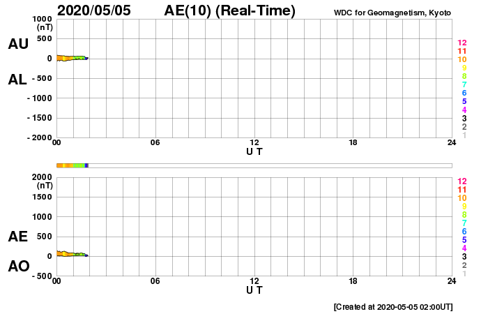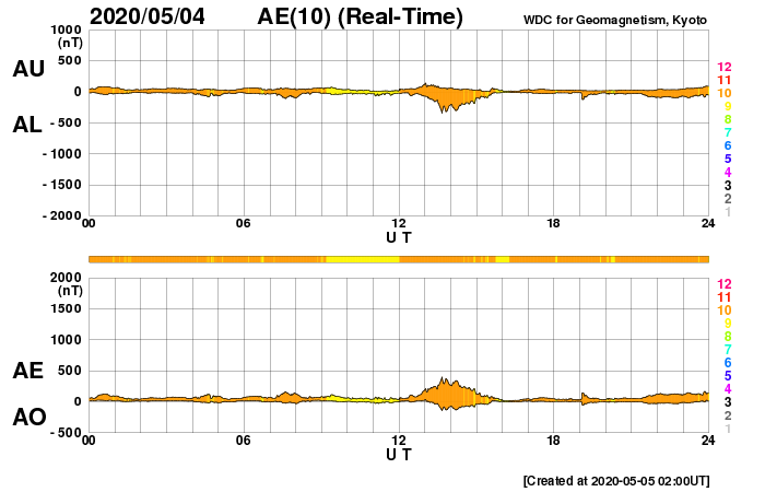 下段のAEグラフの値が高くなると、オーロラ活動が活発化しています。