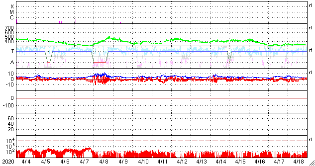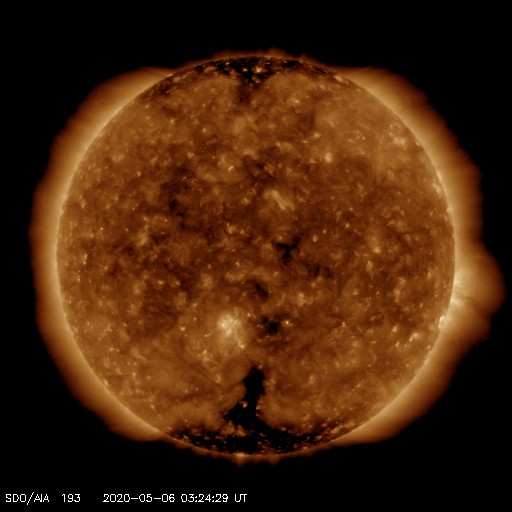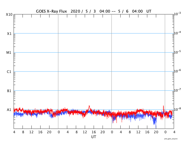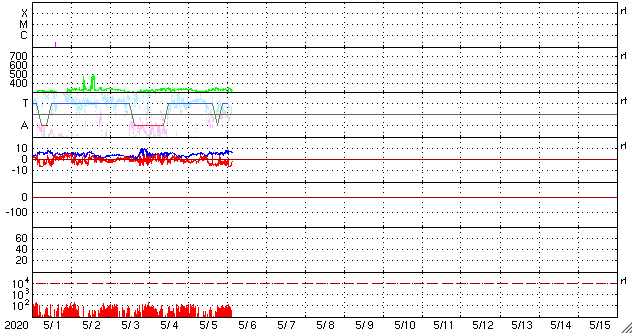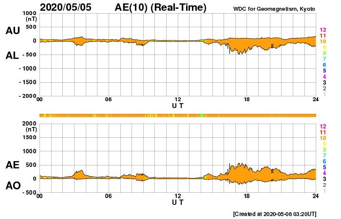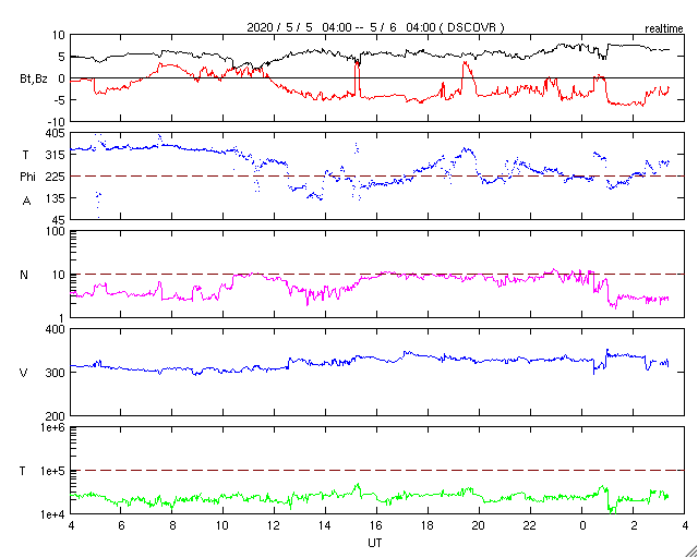 2020/ 5/ 6 12:31 更新 太陽風は低速ですが、磁場が南寄りになって、磁気圏の活動をやや高めています。 担当 篠原 太陽風は、300〜330km/秒と低速の風が続いています。 磁場強度は、5nTから7nTへ少し上がっています。 グラフの途中から、磁場の南北成分が南向きにやや強まり、 -5nT前後の状態が続いています。 太陽風の速度が下がっているため、磁気圏への影響は小さいですが、 AE指数は、300〜500nTの小規模の変化が連続的に発生しています。 SDO衛星AIA193では、太陽の低緯度域にコロナホールは見られず、 この後も穏やかな太陽風が続きそうです。 太陽は無黒点です。 X線グラフも静かです。