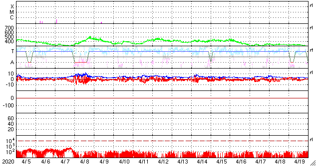 磁場の南北成分は、南寄りの傾向が続いていますが、