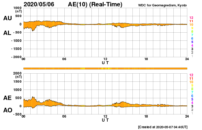 下段のAEグラフの値が高くなると、オーロラ活動が活発化しています。