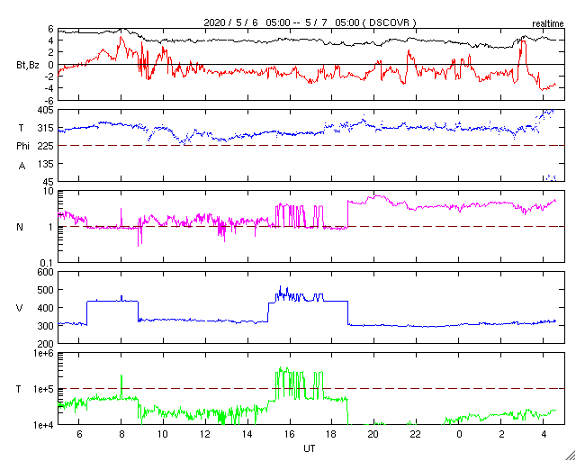 - 2020/ 5/ 6 12:31 太陽風は低速ですが、磁場が南寄りになって、磁気圏の活動をやや高めています。