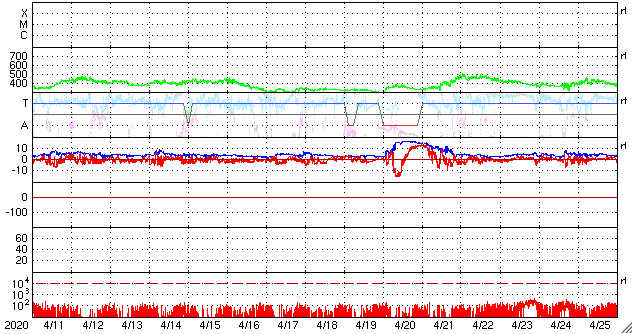 2020/ 5/ 8 12:30 太陽風は低速で、磁気圏も穏やかです。4月の黒点数は 5.4 でした。