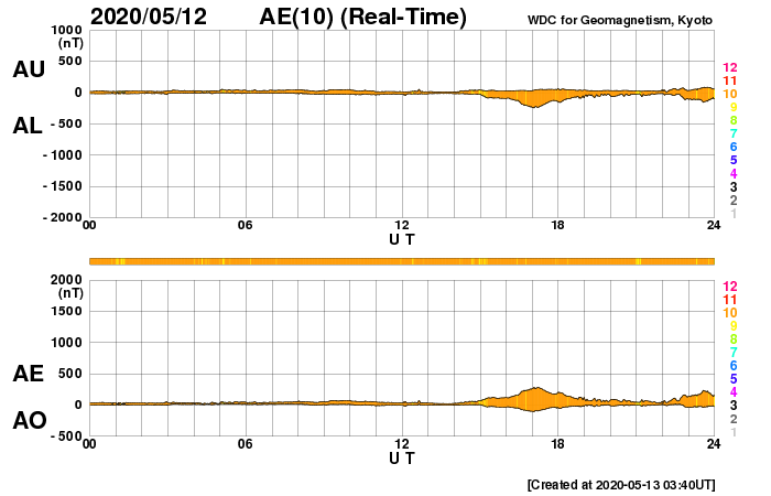 下段のAEグラフの値が高くなると、オーロラ活動が活発化しています。