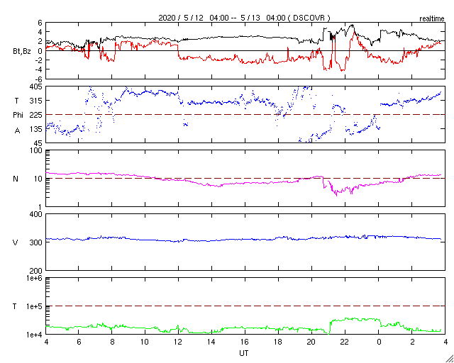 2020/ 5/11 12:08 低速の太陽風が続いています。太陽風の磁場が南寄りになっています。