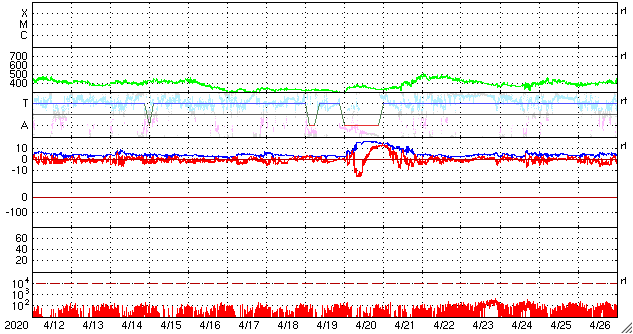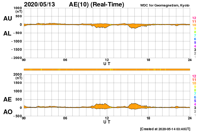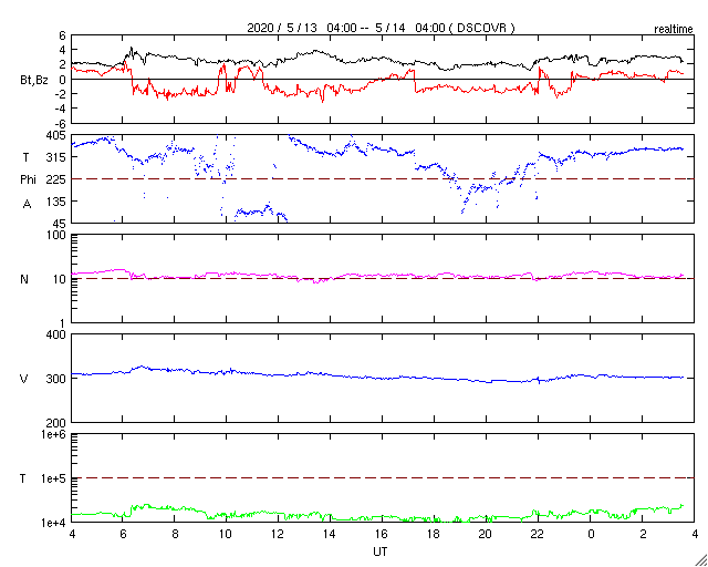2020/ 5/14 12:50 更新 太陽風は300km/秒と低速で、磁気圏も穏やかです。 担当 篠原 太陽風は、300km/秒と低速の状態が続いています。 太陽風速度のグラフは、300の高さに横線を引いたようになっています。 磁場強度は2〜4nTで、やや弱い状態です。 磁場の南北成分は、弱い南向きの変化が半日ほど続いています。 しかし、振れ幅は小さく、速度も下がっているため、 磁気圏への影響は小さく、 AE指数は250nTの小さい高まりが2回起きているだけです。 SDO衛星AIA193は、南極域のコロナホールが目立つ程度です。 太陽風は穏やかな状態が続きそうです。 太陽は無黒点です。 STEREO Ahead衛星によると、 太陽の左端の向こう側にある活動的な領域は、 次第にこちら側に近付いています。 地球から見える様になるのは、3日後くらいでしょうか。 ![]() SDO衛星のAIA193カメラによる太陽コロナの様子 (c) SDO (NASA) ![]() SDO衛星による太陽の可視光写真 (c) SDO (NASA) ![]() DSCOVRが観測した太陽風の磁場(1番上の枠、黒線は全体の強度、赤線は南北成分) および、太陽風の密度(3番目の紫線)、速度(4番目の青線) (c) データ:NOAA/SWPC、作図:宇宙天気ニュース ![]() AE指数(速報値) 下段のAEグラフの値が高くなると、オーロラ活動が活発化しています。 (c) 京都大学WDC ![]() ![]() 27日の太陽周期に合わせたデータプロット 太陽が同じ面を地球に向けていた27日前の変化から、今後を予想することができます。 (c) 作図:宇宙天気ニュース