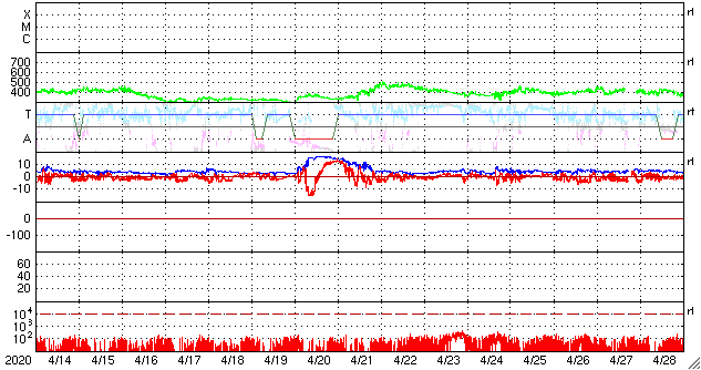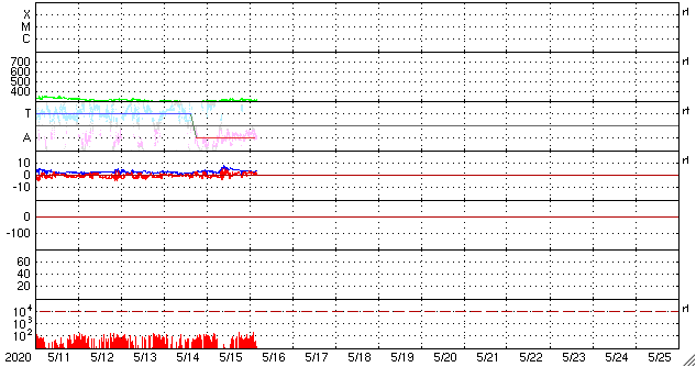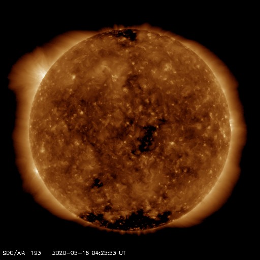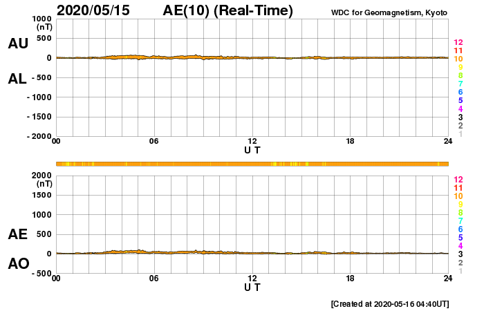 2020/ 5/16 13:46 更新 太陽風は低速で、磁気圏もとても穏やかです。 担当 篠原 太陽風は、今日も300〜320km/秒の低速の状態で安定しています。 磁場強度は、一時的に8nTに少し強まる変化が発生していますが、 すぐに下がって、現在は3nTとやや弱い状態に戻っています。 磁場の南北成分は、弱い北寄りになっています。 低速風ということもあり、磁気圏はとても穏やかです。 AE指数は変化が見られない状態です。 SDO衛星AIA193では、 太陽の中央部に小さいコロナホールが見えています。 3日後くらいの太陽風に、弱い変化が見られるかもしれません。 その他は、極域を除いてぼんやりと光っているだけで、 基本的には、穏やかな太陽風が続きそうです。 太陽は無黒点です。 SDO衛星AIA193では、北東の端(左上)が明るくなっていて、 活動的な領域がこちら側に近づいています。 X線グラフの強度も上がり始めていて、 Aクラスの小さい変化も発生しています。 明日にはこの領域が見えそうです。