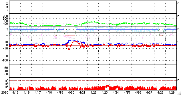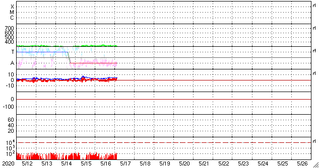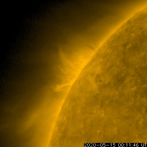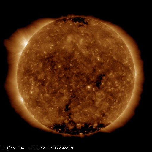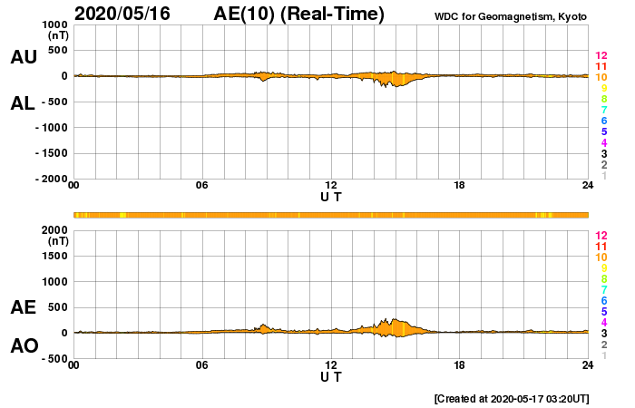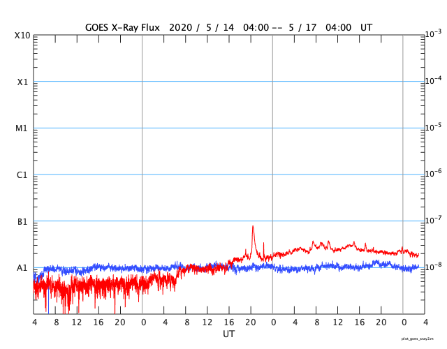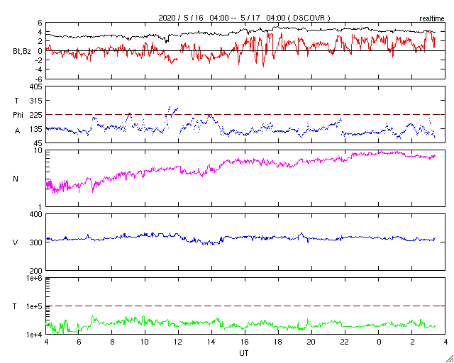2020/ 5/17 12:36 更新 太陽の東端から活動的な領域が2つ現れています。低速の太陽風が続いています。 担当 篠原 太陽の北東の端(左上)から、 注目していた新しい活動領域が現れ始めています。 SDO衛星の磁場写真では磁場の強まりが見えていて、 可視光写真でも白斑が見えている様です。 黒点があるかどうかはまだ分かりません。 SDO衛星AIA171による、この領域の動画を掲載します。 (さかのぼって見ると、この様な動画を掲載するのは1年ぶりです) この領域の活動度はどの程度でしょうか。 ほとんど同時に、南東の端(左下)からも活動的な領域が現れていて、 はっきりとは分からないのですが、黒点が見えている様です。 STEREO Ahead衛星によると、 こちらは、昨日くらいから発生した様です。 X線グラフでは、昨日のA7.9以降特に変化はありません。 今後の推移に注目してください。 太陽風は、300〜320km/秒の低速の風が続いています。 磁場強度は、3nTから4nTに少し上がっています。 磁場の南北成分は、 グラフの前半は0nT付近で、後半は弱い北寄りに変わっています。 このため磁気圏は穏やかで、 AE指数は、小さい変化が見られる程度です。 SDO衛星AIA193の低緯度域は、 小さいコロナホールが見られる程度です。 穏やかな太陽風が続きそうです。