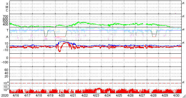 磁場強度は、4nT前後と平均的な状態です。