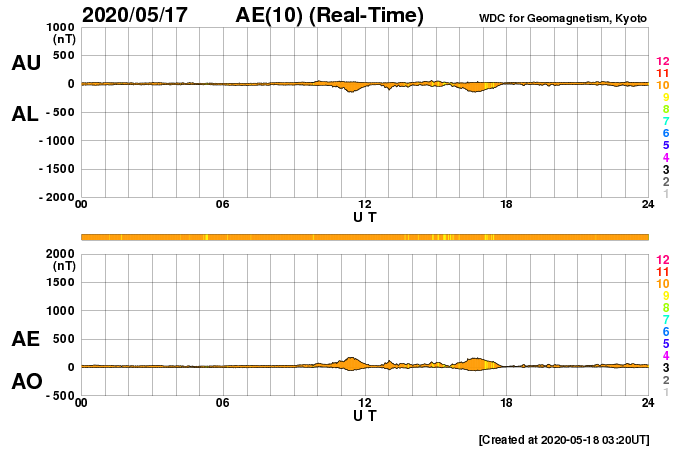 下段のAEグラフの値が高くなると、オーロラ活動が活発化しています。