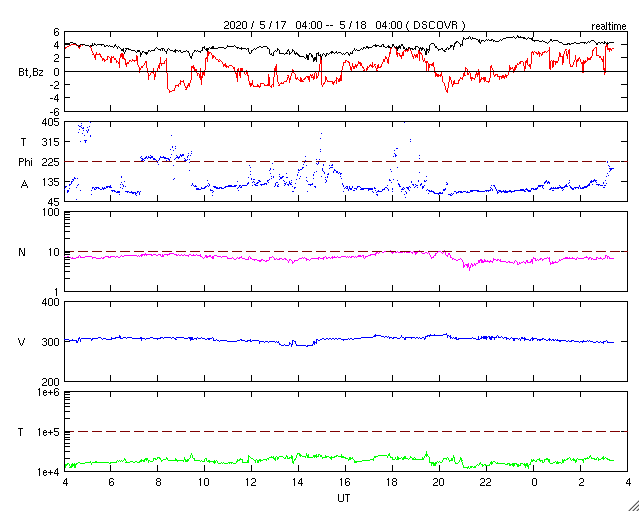 2020/ 5/15 11:57 低速の太陽風が続いています。磁気圏もとても穏やかです。