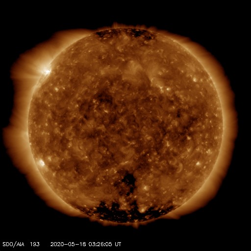 2020/ 5/17 12:36 太陽の東端から活動的な領域が2つ現れています。低速の太陽風が続いています。