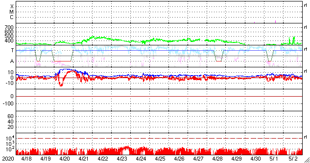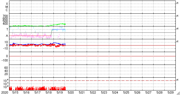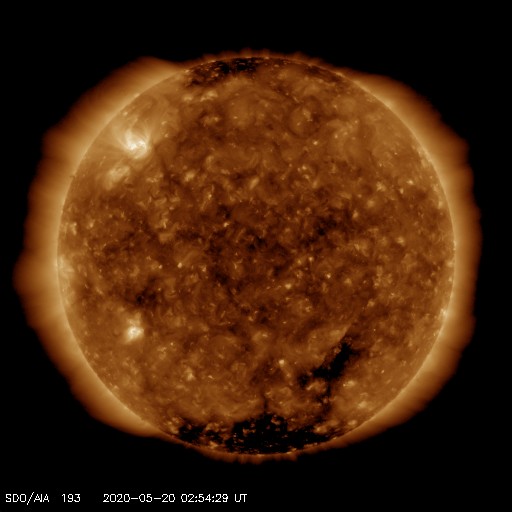 2020/ 5/20 12:09 更新 太陽風はやや低速で、磁気圏も穏やかです。 担当 篠原 昨日のニュースの後も、太陽風の速度は少しずつ上昇し、 昨夜遅くに390km/秒まで上がりました。 一方、8nTに少し強まっていた磁場強度は、 この頃に4nTへ下がっています。 太陽風速度の高まりは、この辺りで一段落となった様で、 現在は370km/秒へ少し下がり、やや低速の状態に戻っています。 磁場強度は、4nTで安定しています。 27日周期の図を見ると分かりやすいですが、 どちらも小さい変化で、太陽風としては穏やかな状態が続いています。 磁場の南北成分は、昨日のニュースの後に南向きにやや強まりました。 (太陽風のグラフの前半の変化) このため、磁気圏の活動も少し高まって、 AE指数では、300nTの小規模の変化がしばらく続いています。 その後は南北成分が0nT付近になり、磁気圏も穏やかになっています。 SDO衛星AIA193では、 太陽の低緯度域はぼんやりと光っているだけです。 穏やかな太陽風が続きそうです。 太陽は無黒点です。 X線グラフも変化はなく、太陽は穏やかです。