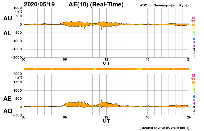 (c) SDO (NASA) ![]() SDO衛星による太陽の可視光写真 (c) SDO (NASA) ![]() DSCOVRが観測した太陽風の磁場(1番上の枠、黒線は全体の強度、赤線は南北成分) および、太陽風の密度(3番目の紫線)、速度(4番目の青線) (c) データ:NOAA/SWPC、作図:宇宙天気ニュース ![]() AE指数(速報値) 下段のAEグラフの値が高くなると、オーロラ活動が活発化しています。 (c) 京都大学WDC ![]() ![]() 27日の太陽周期に合わせたデータプロット 太陽が同じ面を地球に向けていた27日前の変化から、今後を予想することができます。 (c) 作図:宇宙天気ニュース