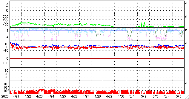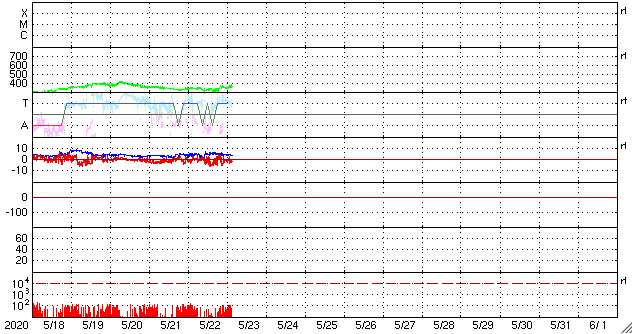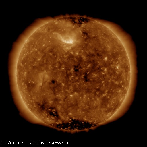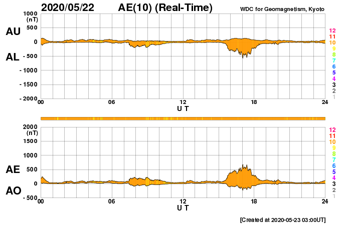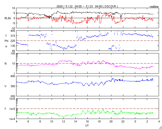 2020/ 5/23 12:15 更新 低速の太陽風が続いています。太陽は無黒点です。 担当 篠原 太陽風は、350km/秒と低速の状態が続いています。 磁場強度は、5nTと平均的な値です。 磁場の南北成分は、グラフの中盤で南寄りになっています。 この影響で、AE指数に500nTの中規模の変化が発生しています。 その後、南北成分は0nT付近で小さくなり、 AE指数も穏やかになっています。 SDO衛星AIA193は、 太陽の南東の高緯度側にコロナホールが見えてきました。 緯度が高めなので、太陽風への影響は小さくなりそうです。 太陽は無黒点です。 昨日北半球で見えていたとても小さい黒点は、 現在は見えなくなっています。 X線グラフは特に変化がありませんが、 SDO衛星AIA193の動画を見ると、南半球の中央部の領域で、 小さい爆発現象が数回発生しています。 ![]() SDO衛星のAIA193カメラによる太陽コロナの様子 (c) SDO (NASA) ![]() SDO衛星による太陽の可視光写真 (c) SDO (NASA) ![]() DSCOVRが観測した太陽風の磁場(1番上の枠、黒線は全体の強度、赤線は南北成分) および、太陽風の密度(3番目の紫線)、速度(4番目の青線) (c) データ:NOAA/SWPC、作図:宇宙天気ニュース ![]() AE指数(速報値) 下段のAEグラフの値が高くなると、オーロラ活動が活発化しています。 (c) 京都大学WDC ![]() ![]() 27日の太陽周期に合わせたデータプロット 太陽が同じ面を地球に向けていた27日前の変化から、今後を予想することができます。 (c) 作図:宇宙天気ニュース