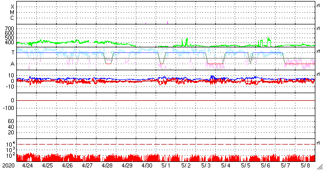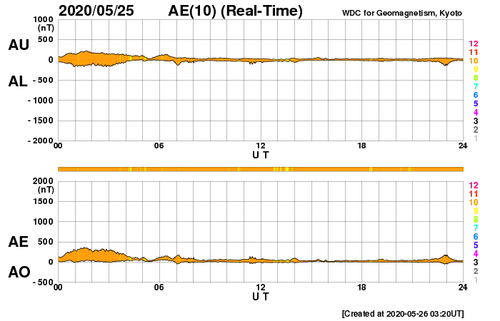 (c) SDO (NASA) ![]() SDO衛星による太陽の可視光写真。マウスの矢印を写真に重ねると、黒点番号付きの写真に切り替わります。 (c) SDO (NASA) ![]() GOES衛星の太陽X線強度。赤・橙 = 0.1〜0.8 nm、青・紫 = 0.05〜0.4 nm (c) データ:NOAA/SWPC、作図:宇宙天気ニュース ![]() DSCOVRが観測した太陽風の磁場(1番上の枠、黒線は全体の強度、赤線は南北成分) および、太陽風の密度(3番目の紫線)、速度(4番目の青線) (c) データ:NOAA/SWPC、作図:宇宙天気ニュース ![]() AE指数(速報値) 下段のAEグラフの値が高くなると、オーロラ活動が活発化しています。 (c) 京都大学WDC ![]() ![]() 27日の太陽周期に合わせたデータプロット 太陽が同じ面を地球に向けていた27日前の変化から、今後を予想することができます。 (c) 作図:宇宙天気ニュース