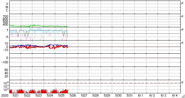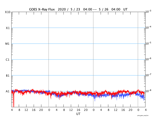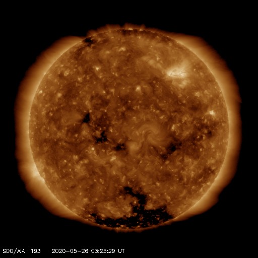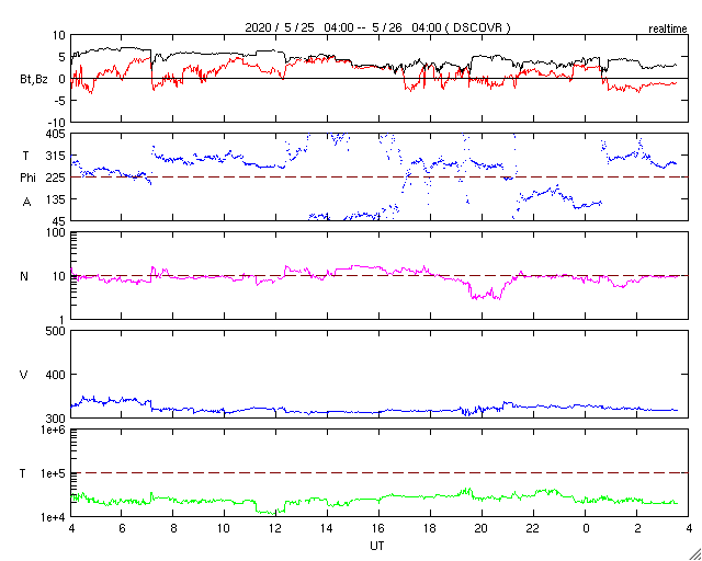 2020/ 5/26 12:41 更新 太陽に小さい黒点が見えています。低速の太陽風が続いています。 担当 篠原 SDO衛星の可視光写真を拡大すると、 太陽の西の端近くの低緯度に、 今朝から小さい黒点が現れている様です。 掲載の写真では、黒点は小さすぎて分かりません。 AIA193のコロナ写真で、小さく明るく光っている領域です。 このまま消えると、黒点群の番号は付かないままになりそうです。 太陽風は、310〜320km/秒と低速の風が続いています。 磁場強度は、3〜5nTへ少し下がっています。 昨日のニュース以降、 磁場の南北成分は北寄りか0nT付近になっていて、 磁気圏は静かになっています。 SDO衛星AIA193の太陽コロナ写真は、 赤道域に小さいコロナホールがぽつぽつ見えている程度です。 この後も穏やかな太陽風が続きそうです。