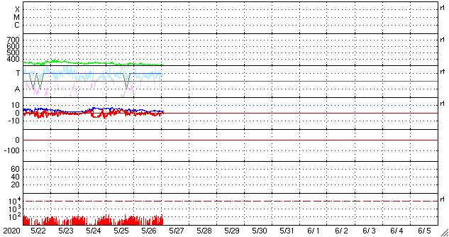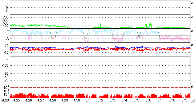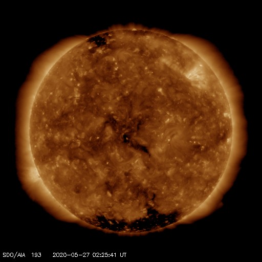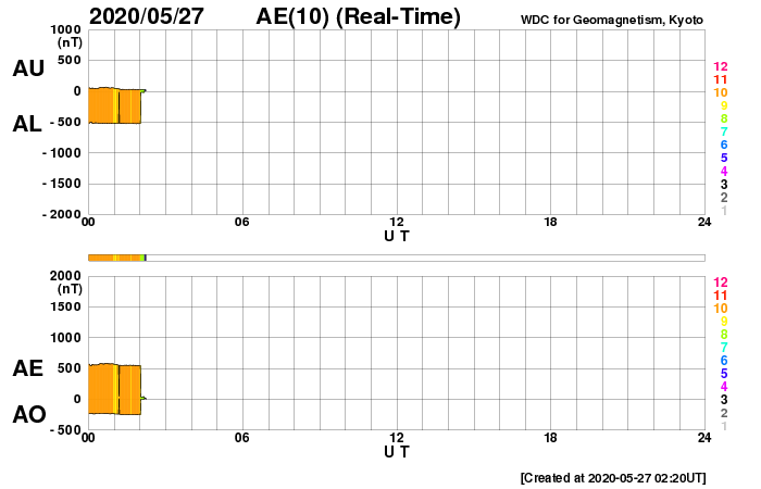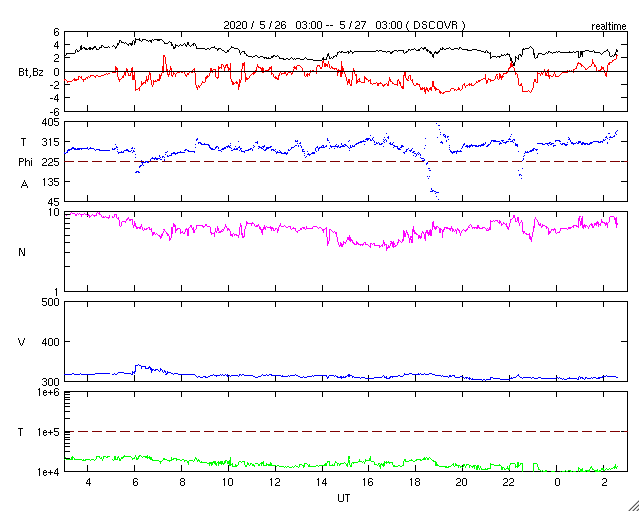 2020/ 5/27 11:42 更新 低速の太陽風が続いています。太陽は無黒点です。 担当 篠原 太陽風は、310km/秒と低速の風が続いています。 磁場強度も、3nTとやや弱い状態です。 磁場の南北成分は、 弱い南向きの変化が発生している程度です。 速度がだいぶ下がっている事もあり、磁気圏は穏やかです。 (今日のAE指数のグラフは、後半からデータエラーが起きています) 27日周期の図を見ると、 前周期の太陽風は、4月30日以降300km/秒台の低速風が続いています。 掲載しているグラフの後もこの状態が続き、 グラフの右端のさらに10日後、 5月19日にやっと400km/秒に高まる程度です。 SDO衛星AIA193は、 太陽の中央部に小さいコロナホールが見える程度で、 この後も穏やかな太陽風が続きそうです。 昨日見えていた小さい黒点は、すぐに見えなくなり、 現在は無黒点です。 太陽は穏やかな状態が続いています。
