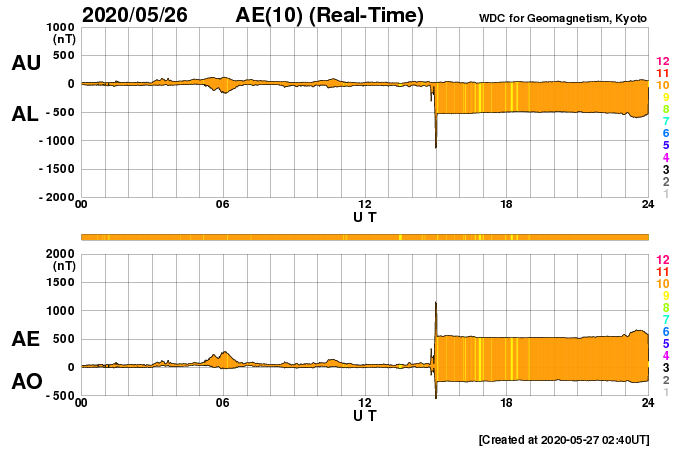 (c) SDO (NASA) ![]() SDO衛星による太陽の可視光写真 (c) SDO (NASA) ![]() DSCOVRが観測した太陽風の磁場(1番上の枠、黒線は全体の強度、赤線は南北成分) および、太陽風の密度(3番目の紫線)、速度(4番目の青線) (c) データ:NOAA/SWPC、作図:宇宙天気ニュース ![]() AE指数(速報値) 下段のAEグラフの値が高くなると、オーロラ活動が活発化しています。 (c) 京都大学WDC ![]() ![]() 27日の太陽周期に合わせたデータプロット 太陽が同じ面を地球に向けていた27日前の変化から、今後を予想することができます。 (c) 作図:宇宙天気ニュース
