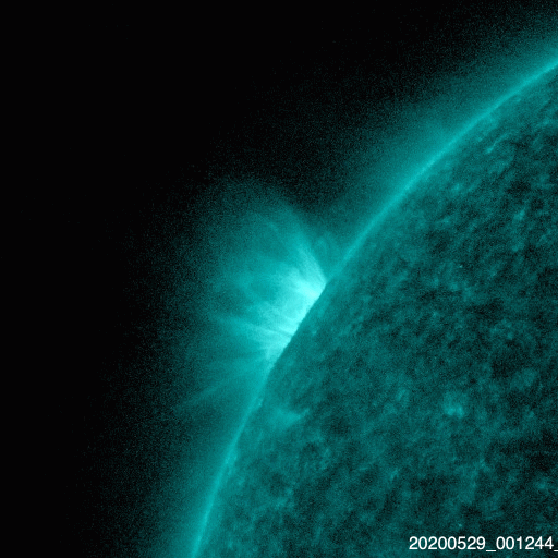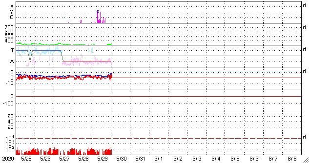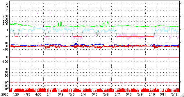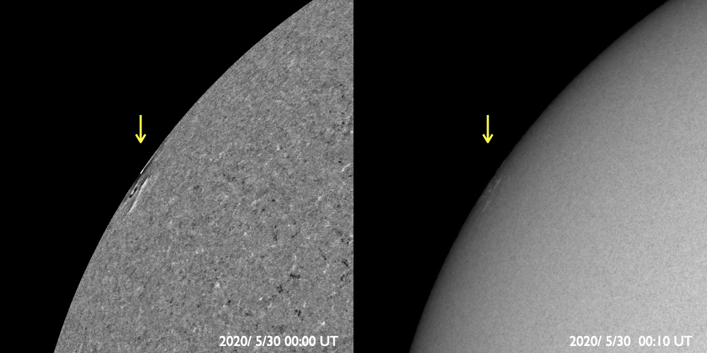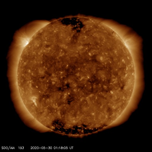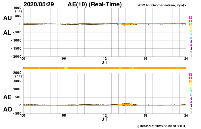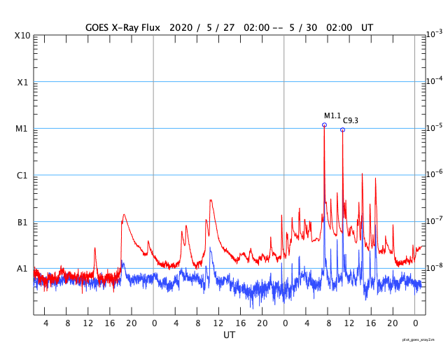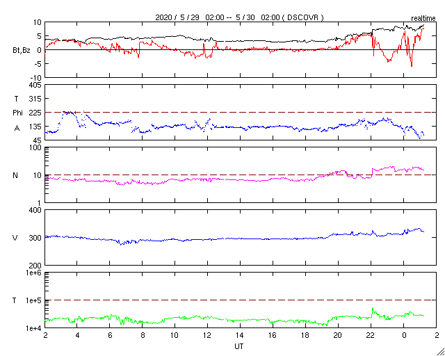 2020/ 5/30 10:25 更新 太陽の北東端でM1.1の中規模フレアが発生しました。Mフレアは2年7か月ぶりです。 担当 篠原 昨日のニュースの後も、太陽の北東端の領域の活動は続き、 夕方、29日16時(世界時29日7時)に、 M1.1の中規模フレアが発生しました。 Mクラスフレアの発生はかなり久しぶりで、 2017年10月20日(世界時)のM1.1 (偶然ですが、同じ規模でした)以来、 2年7か月ぶりのことです。 また、あと一歩という規模であれば、 ちょうど1年前の2019年5月6日に、 C9.9というMクラスぎりぎりのCクラスフレアが発生しています。 この領域では、直後の29日19時半(世界時29日10時半)にも C9.3の小規模フレアが発生しています。 SDO衛星AIA131、171による、これらのフレアの動画を掲載します。 SDO衛星の磁場や可視光写真では、この領域が見え始めています。 今のところ、磁場の強まりと可視光写真では白斑が見えていますが、 黒点の様子は分かりません。 X線グラフを見ると、活動の高まりは一旦終息して、 全体の強度は下がっています。 この後、再び活動が高まるかどうか注目してください。 太陽風の速度は、300km/秒から290km/秒へ少し下がり、 現在は330km/秒へ少し上がっています。 小さい変化で、低速の風が続いています。 磁場強度は、3nTとやや弱い状態になっていましたが、 グラフの最後で8nTと少し強まっています。 磁場の南北成分は、0nT付近か北寄りの傾向です。 このため、磁気圏はとても穏やかで、 AE指数は、ほとんど変化のない状態です。 太陽風は穏やかな状態が続きそうです。