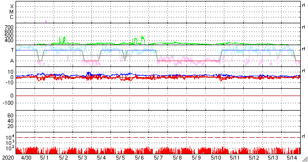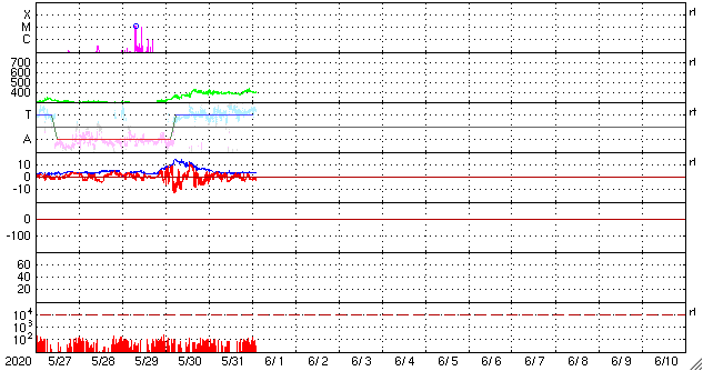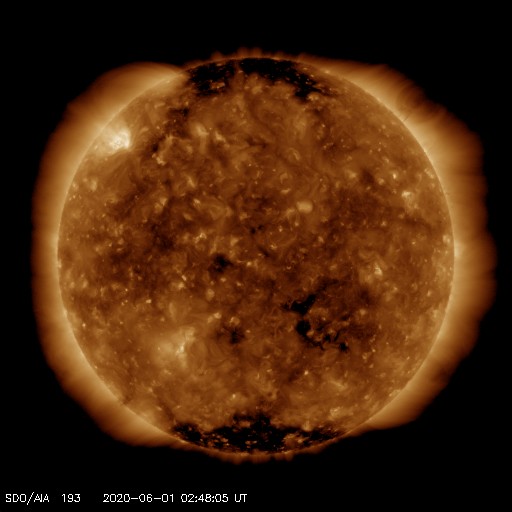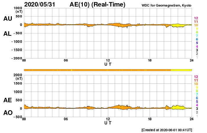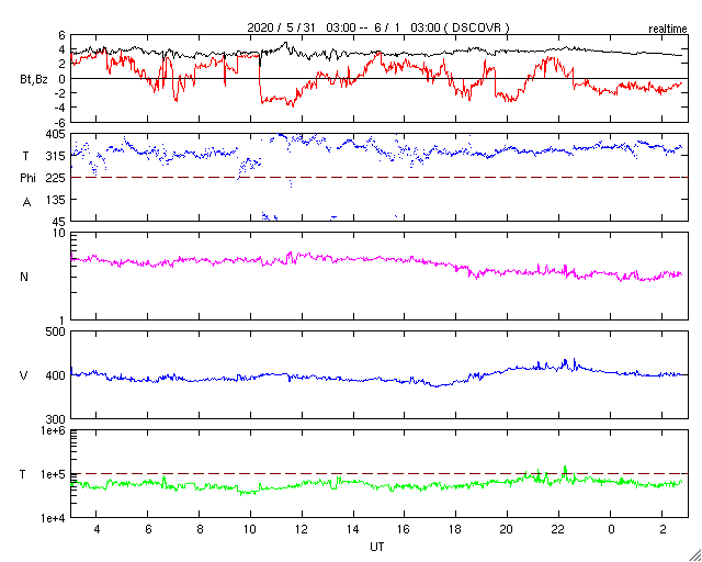 2020/ 6/ 1 11:58 更新 太陽風は平均的な速度が続いています。太陽は穏やかです。 担当 篠原 太陽風は、400lkm/秒と平均的な速度で安定し、 磁場強度は、3〜4nTとやや弱い状態が続いています。 磁気圏は穏やかで、 AE指数は、200nTの小規模の変化が時々発生する程度です。 SDO衛星AIA193の太陽コロナ写真では、 低緯度域は全体的にぼんやりと光っていて、 太陽風は穏やかに推移しそうです。 SDO衛星の可視光写真を拡大すると、 北東(左上)のフレアを起こした領域には、 今日も小さい黒点が見えている様です。 X線グラフに特に変化はなく、 太陽は穏やかな状態です。