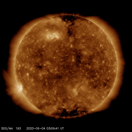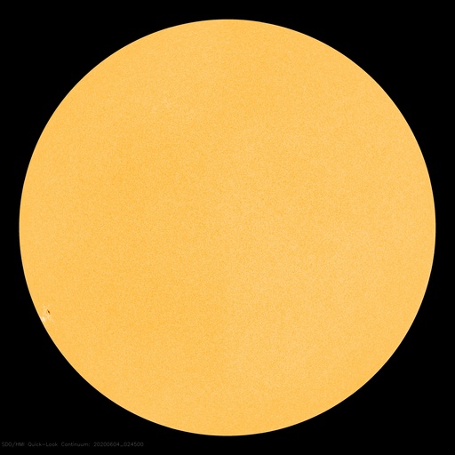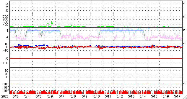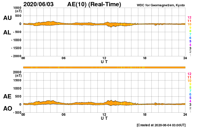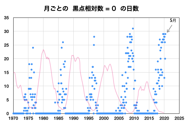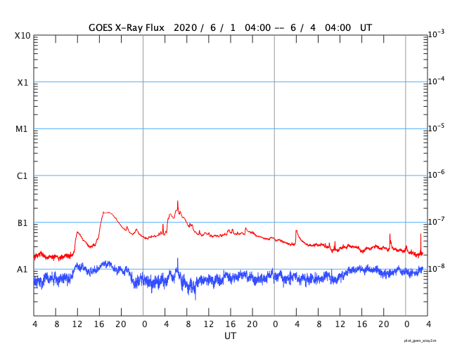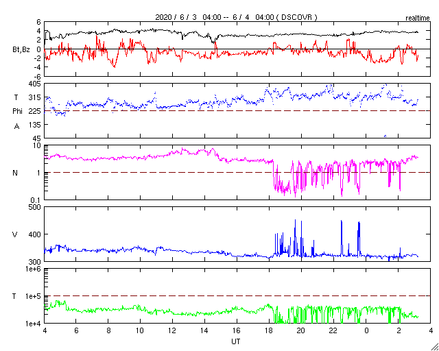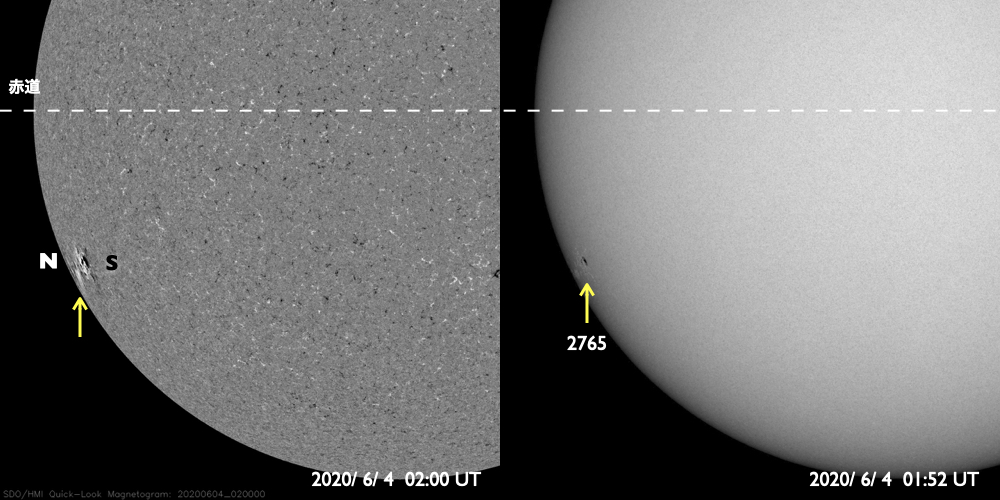 2020/ 6/ 4 12:23 更新 東端の黒点は2765群となりました。5月の黒点数は 0.2 でした。 担当 篠原 WDC-SILSOより、 5月の黒点相対数の月平均値は、 0.2 と発表されました。 5月1日に 4 、31日に 2 と、 小さい数値が2回記録されているだけで、 その間の29日間は無黒点となっています。 0.2 という値は、今回の極小期のここまでの記録としては最小値です。 これに次ぐのは、2020年2月と2019年10月の 0.4 です。 また、前回の極小期では、 2009年8月に 0 (1か月間無黒点)や、2008年8月に 0.3 、 という小さい値が記録されています。 現在、東端に新しい周期の黒点が現れていて、 そちらに注目が行ってしまいますが、 長い目で見ると、まだこの様な状態でもあるのです。 太陽の東端に現れた黒点は、2765群と番号が付けられています。 位置は南緯24度と高めで、磁場の並びも新しい第25期の順番です。 X線グラフを見ると、Aクラスの小さい変化が数回発生していますが、 活動は落ちつている印象です。 一旦静かになって、再び高まるのか、 このまま弱まっていくのか、今後の推移に注目して下さい。 太陽風は、小幅ですが320km/秒へ速度が下がっています。 磁場強度は、3〜4nTとやや弱い状態です。 磁気圏は穏やかで、AE指数は小さい変化が見られる程度です。 SDO衛星AIA193では、低緯度域はぼんやりと光っているだけです。 太陽風は穏やかな状態が続きそうです。
