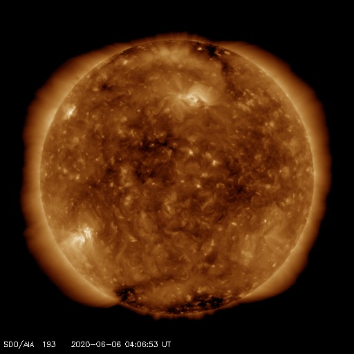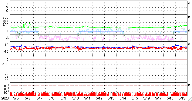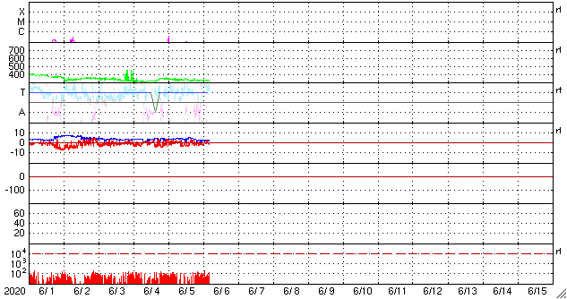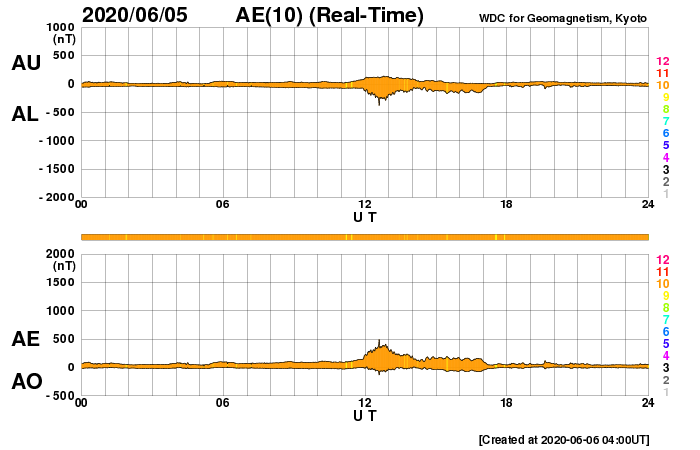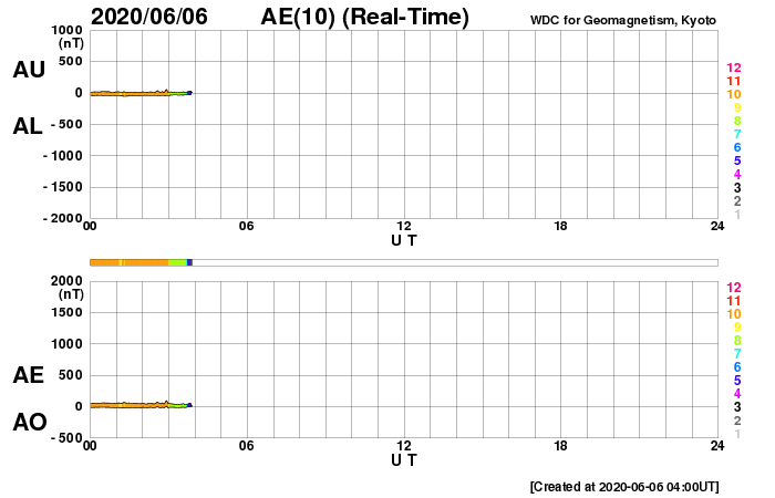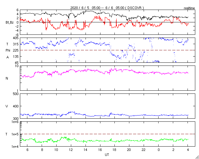 2020/ 6/ 6 13:15 更新 太陽風は低速で磁気圏も穏やかです。カナダのオーロラをどうぞ。 担当 篠原 高坂雄一さんより、 カナダのブリティッシュコロンビア州ランビーで、 現地5月30日1時(世界時30日8時)頃に撮影された オーロラの写真をいただきました。 イエローナイフなどのオーロラ帯と比べると、 緯度で10度くらい南に下がった地域です。 そのため、遠くのオーロラが低い高度に見える という写真になっています。 高坂さんによると、現地の30日1時頃から少し活発になって、 ピンク色のオーロラが撮影できたとのことです。 また、肉眼ではただの白っぽいオーロラだったそうです。 この日は、太陽風の磁場の強まりが到来して、 南向きに磁場が強まり、 AE指数に500〜700nTの中規模の変化が発生しました。 その頃の撮影です。 3枚目の写真の上部の中央には、 左に少し傾いたカシオペヤ座の W が見えています。 また、左から3番目の木のすぐ上に二重星団が、 右側の木の上方には、アンドロメダ星雲が見えています。 静かな状態が続いている中で発生した活動の高まりでした。 美しい記録写真をどうもありがとうございます。 現在の太陽風は、320km/秒と低速の状態が続いています。 磁場強度は、4nTから2nTへ下がり弱くなっています。 磁気圏は穏やかで、 AE指数は小規模の変化が1回起きている程度です。 2765黒点群は、黒点の数が増えています。 一方、X線グラフは小さい変化が見られる程度で、 活動度に特に変化はないようです。