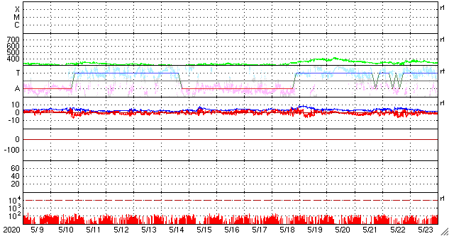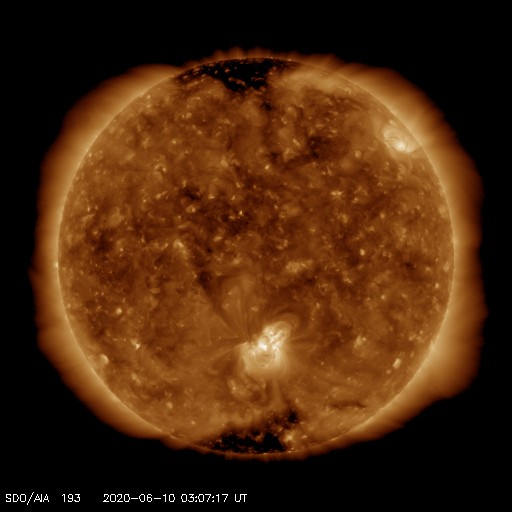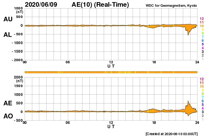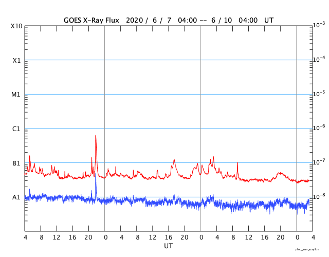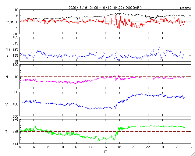 2020/ 6/10 12:19 更新 太陽風はやや高速になっています。太陽は穏やかです。 担当 篠原 太陽風の速度は、 昨夜の段階で400km/秒を割るくらいまで下がったのですが、 今日の未明から再び高まり、 現在は460km/秒とやや高速の状態になっています。 27日周期の図を見ると、 一昨日(6月8日)の速度の高まりと同じくらいの変化になっています。 磁場強度は、速度が高まる頃に7nTへ少し上がりましたが、 現在は下がって、5nTと平均的な状態です。 南北成分は、グラフの中盤で南向きの変化が発生していますが、 その他は0nT付近です。 磁気圏は概ね静穏で、 磁場が南を向いた頃にAE指数に600nTの変化が発生していますが、 その他は変化のない状態です。 SDO衛星AIA193では、 低緯度域に目立つほどのコロナホールは見られません。 今回の速度変化は、どの様に推移するでしょうか。 太陽は2765黒点群が見えていますが、 X線グラフの変化は少なくなり、活動は静かになっている様です。