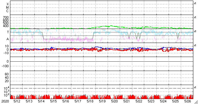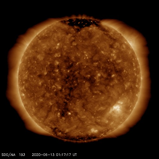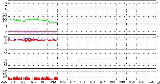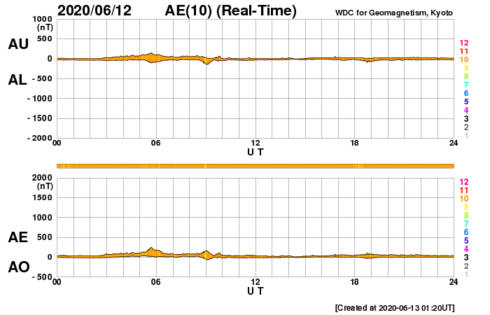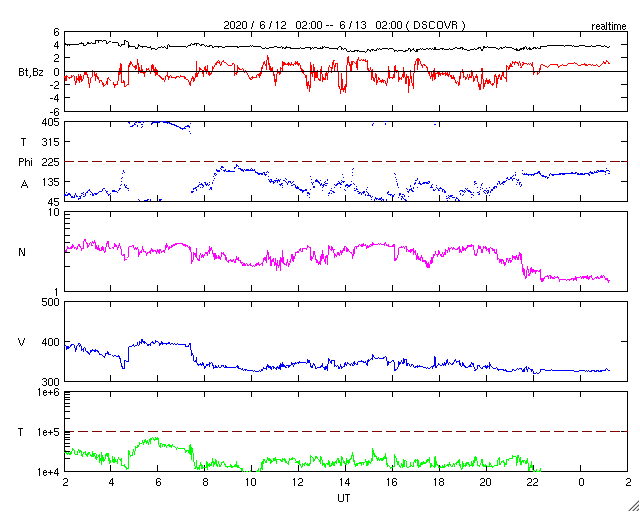 2020/ 6/13 10:24 更新 太陽風は低速になっています。磁気圏も穏やかです。 担当 篠原 太陽風の速度は330km/秒へ下がり、低速の風になっています。 磁場強度も、3〜4nTとやや弱くなっています。 磁場の南北成分は0nT前後で小さく変化する程度で、 速度も下がっているため、磁気圏は穏やかです。 オーロラの活動度を示すAE指数は、ほとんど変化のない状態です。 SDO衛星AAI193の太陽コロナ写真では、 低緯度域は全体がぼんやりと光っていて、 コロナホールは見られません。 8〜11日に見られた様な弱い高まりは起きるかもしれませんが、 基本的には太陽風は穏やかな状態が続くでしょう。 太陽は、北西(右上)に見えていた小さい黒点はその後消えてしまい、 現在は南西(右下)の2765黒点群だけになっています。 X線グラフに特に変化はなく、活動は穏やかです。 ![]() SDO衛星のAIA193カメラによる太陽コロナの様子 (c) SDO (NASA) ![]() SDO衛星による太陽の可視光写真。マウスの矢印を写真に重ねると、黒点番号付きの写真に切り替わります。 (c) SDO (NASA) ![]() DSCOVRが観測した太陽風の磁場(1番上の枠、黒線は全体の強度、赤線は南北成分) および、太陽風の密度(3番目の紫線)、速度(4番目の青線) (c) データ:NOAA/SWPC、作図:宇宙天気ニュース ![]() AE指数(速報値) 下段のAEグラフの値が高くなると、オーロラ活動が活発化しています。 (c) 京都大学WDC ![]() ![]() 27日の太陽周期に合わせたデータプロット 太陽が同じ面を地球に向けていた27日前の変化から、今後を予想することができます。 (c) 作図:宇宙天気ニュース