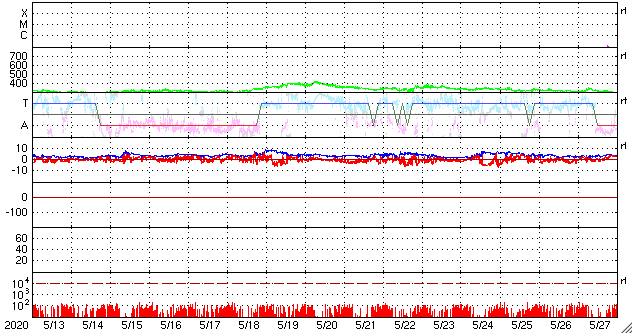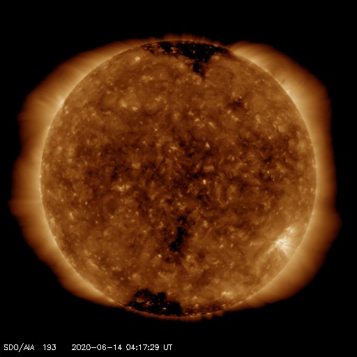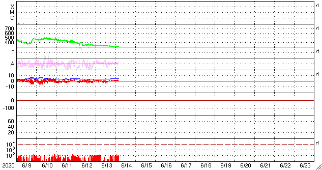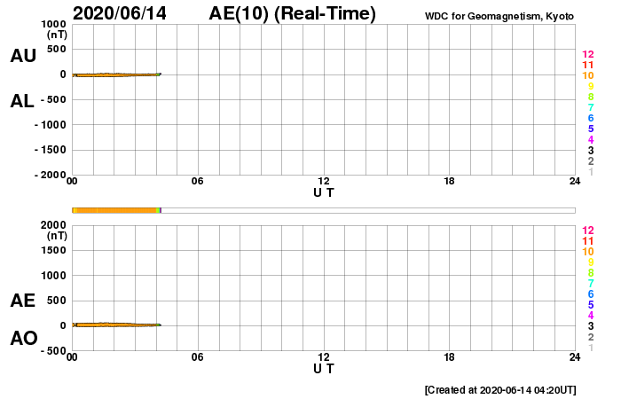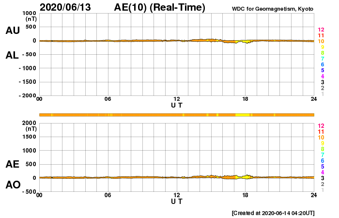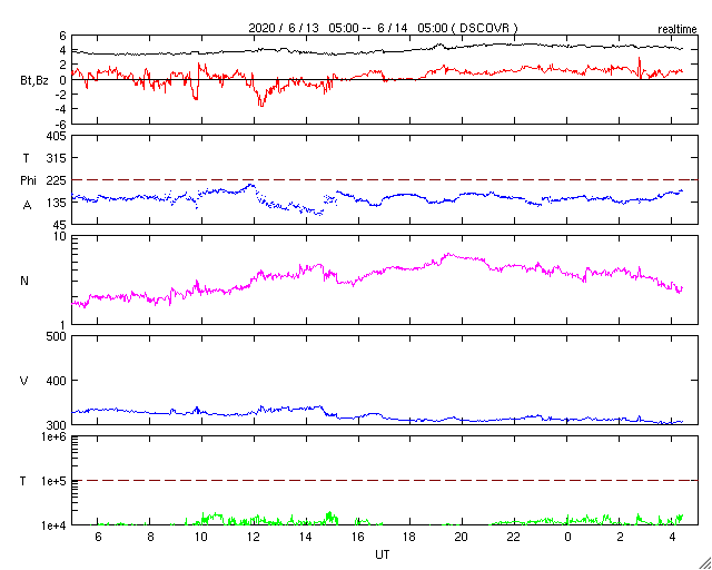 2020/ 6/14 13:31 更新 太陽風は更に低速になっています。磁気圏もとても穏やかです。 担当 篠原 太陽風の速度は更に下がって、300km/秒になっています。 磁場強度は、4nTで安定しています。 磁場の南北成分は、弱い北寄りです。 磁気圏はとても穏やかで、 AE指数はほとんど変化のない状態です。 SDO衛星AIA193では、 中央部の南寄りに小さいコロナホールが淡く見えている程度です。 この後も、穏やかな太陽風が続きそうです。 2765黒点群は、西の端に近付いています。 この他に活動的な領域は見られず、 太陽はこの後無黒点になりそうです。