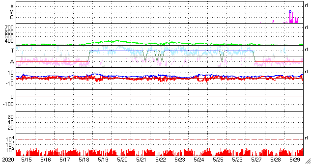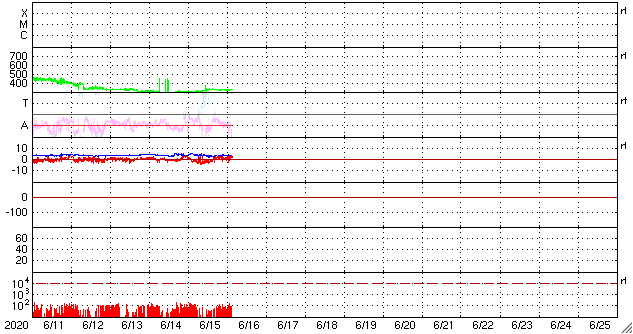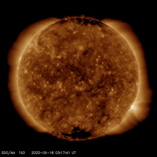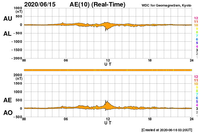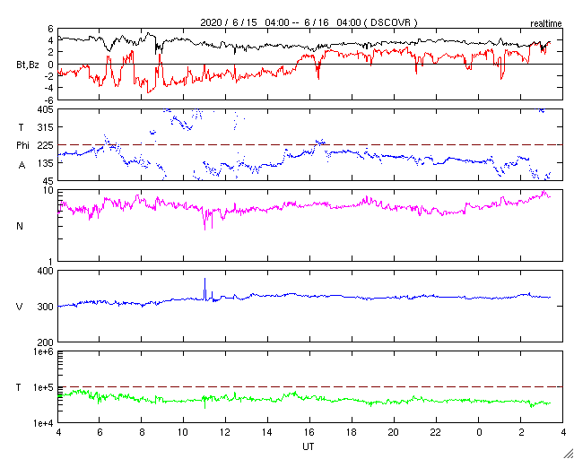 2020/ 6/16 12:31 更新 低速の太陽風が続き、磁気圏も穏やかです。太陽は無黒点です。 担当 篠原 太陽風の速度は、 300km/秒から320km/秒へ少し上がっていますが、 低速の状態が続いています。 磁場強度は、3nTとやや弱くなっています。 磁場の南北成分は、グラフの前半は南寄りで、 後半は北寄りに変わっています。 速度が下がっているため、磁気圏は基本的に穏やかで、 AE指数は、500nTの小規模の変化が1回起きている程度です。 SDO衛星AIA193の太陽コロナ写真は、 全体がぼんやりと光っているだけで、 太陽風は穏やかな状態が続きそうです。 2765黒点群は西の端に沈み、太陽は無黒点になっています。 STEREO Ahead衛星を見ると、 太陽の東端の向こう側に、小さい活動的な領域がある様です。 この後こちら側に回ってきますが、どの様な領域でしょうか。