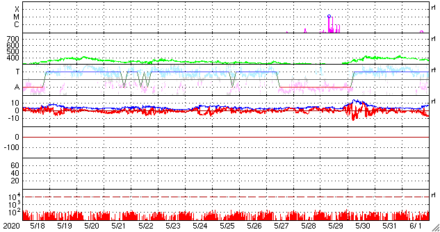 - 2020/ 6/14 13:31 太陽風は更に低速になっています。磁気圏もとても穏やかです。