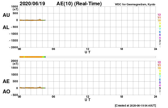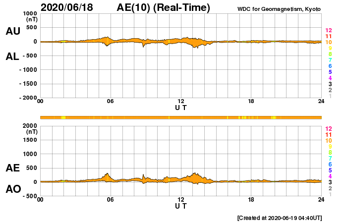 下段のAEグラフの値が高くなると、オーロラ活動が活発化しています。