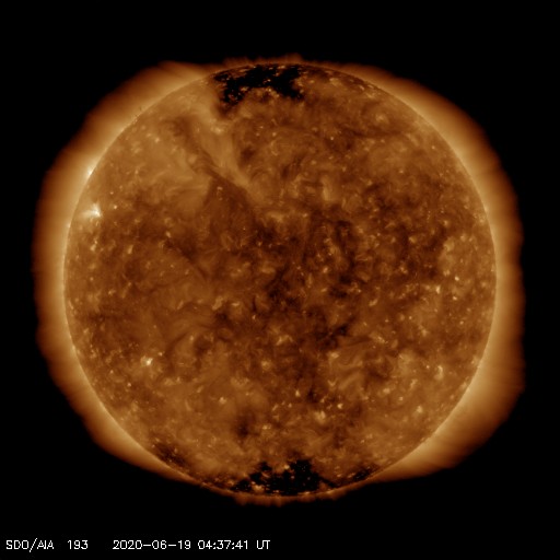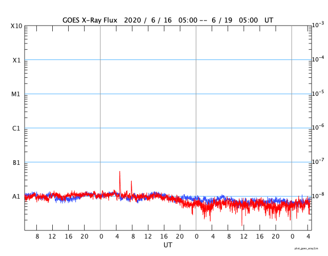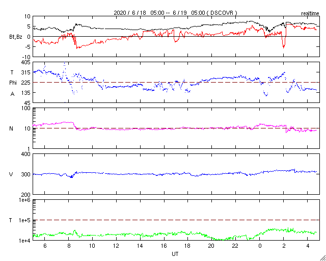 - 2020/ 6/18 11:31 太陽風の速度は280km/秒に下がっています。太陽は無黒点です。