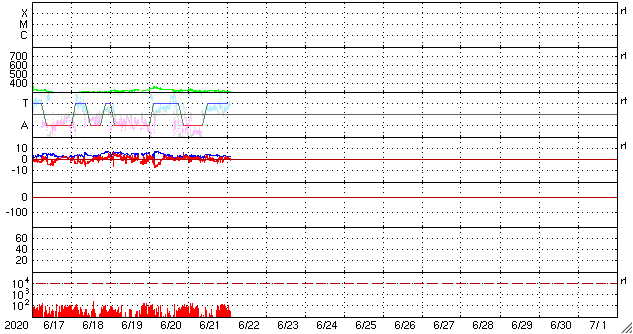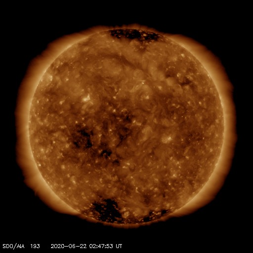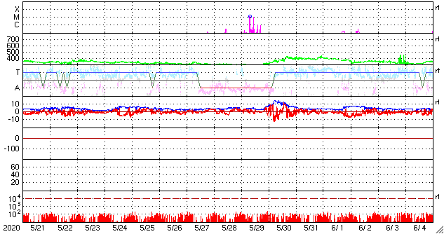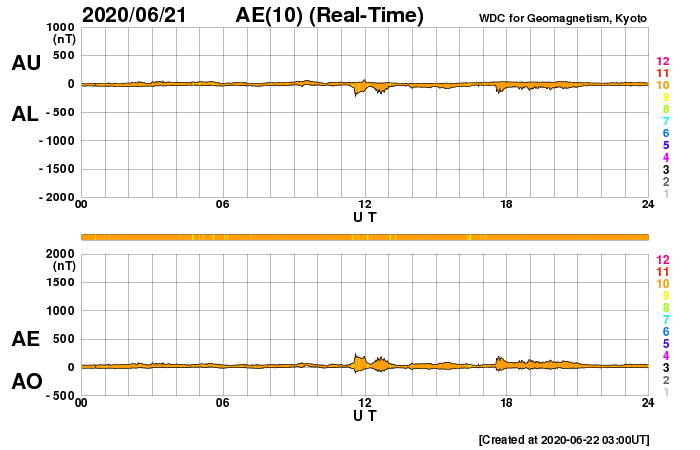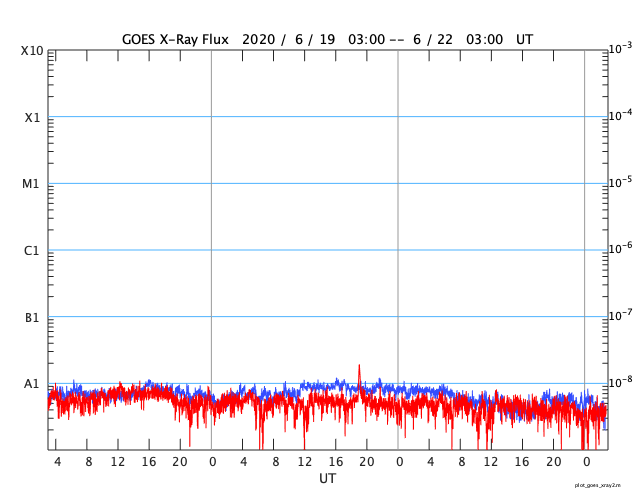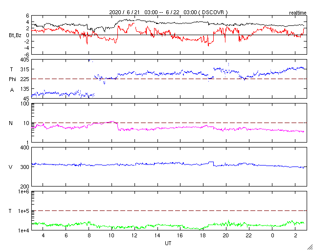 2020/ 6/22 12:00 更新 太陽風は更に低速になっています。磁気圏も穏やかです。 担当 篠原 太陽風の速度は、320km/秒から310lkm/秒へ下がり、 グラフの最後では300km/秒を少し割るくらいに下がっています。 小幅の変化ですが、太陽風は更に低速になっています。 磁場強度は、3nT前後でやや弱い状態です。 南北成分は、南北に振れていますが小さい変化です。 磁気圏は静穏で、 AE指数は時々小さい変化が起きている程度です。 SDO衛星AIA193では、 太陽中央部の東寄りに淡いコロナホールが見えています。 4〜5日後くらいの太陽風に、この領域の影響が現れるでしょうか。 それがなければ、低速の穏やかな太陽風が続きそうです。 太陽は無黒点です。 X線グラフも静かです。 昨日の部分日食は、時々小雨がぱらつく様な天候で、 ネットの中継を見るしかありませんでした。 九州でも北部は晴れていたようで、少しの差で残念な結果になりました。 今日の鹿児島は、朝から青空が広がっています。 ![]() SDO衛星のAIA193カメラによる太陽コロナの様子 (c) SDO (NASA) ![]() SDO衛星による太陽の可視光写真 (c) SDO (NASA) ![]() DSCOVRが観測した太陽風の磁場(1番上の枠、黒線は全体の強度、赤線は南北成分) および、太陽風の密度(3番目の紫線)、速度(4番目の青線) (c) データ:NOAA/SWPC、作図:宇宙天気ニュース ![]() AE指数(速報値) 下段のAEグラフの値が高くなると、オーロラ活動が活発化しています。 (c) 京都大学WDC ![]() ![]() 27日の太陽周期に合わせたデータプロット 太陽が同じ面を地球に向けていた27日前の変化から、今後を予想することができます。 (c) 作図:宇宙天気ニュース