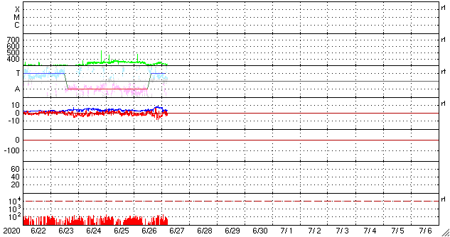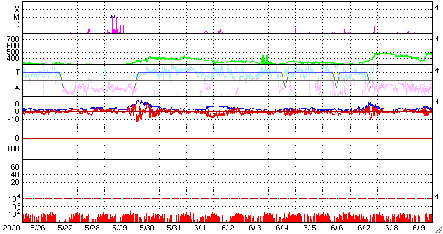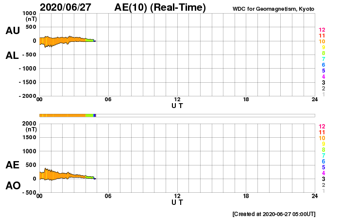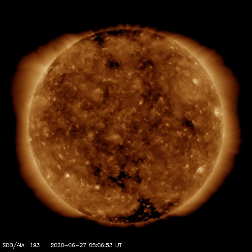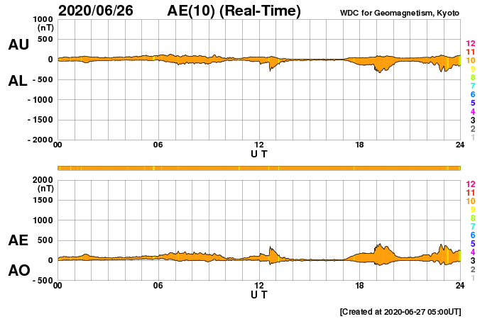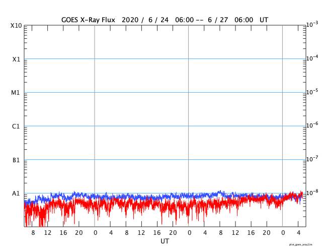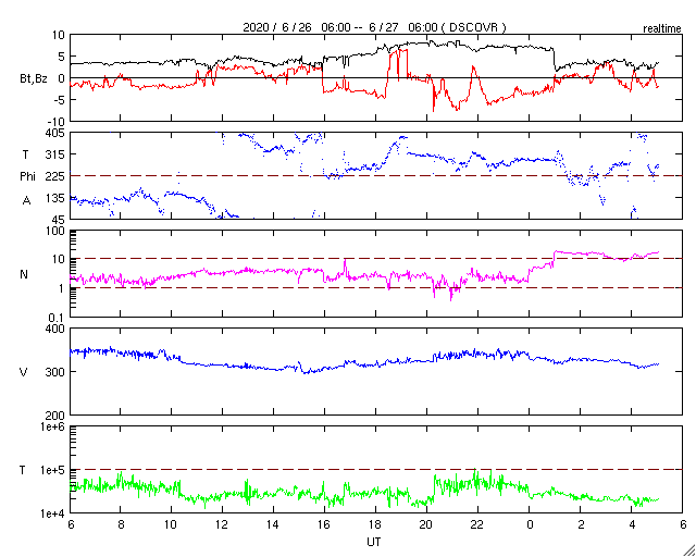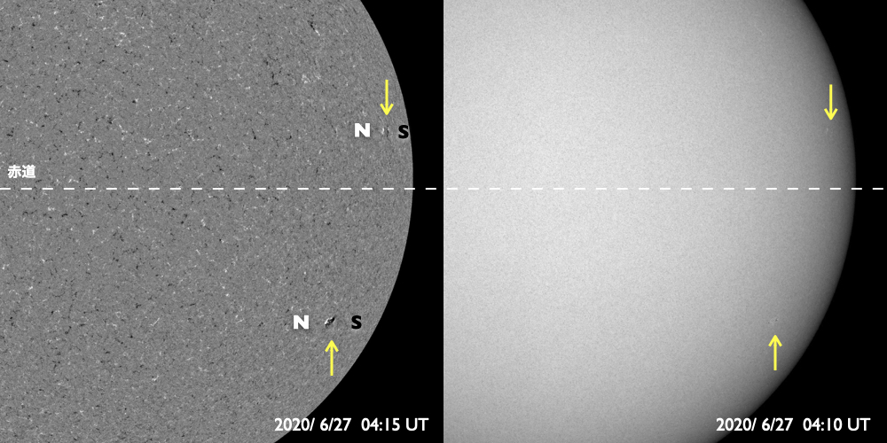 2020/ 6/27 14:19 更新 太陽の西側の2か所に小さい黒点が現れています。太陽風は低速です。 担当 篠原 太陽の西側(右側)の2か所に小さい黒点が現れています。 ひとつは、西の端近くの北緯10度程度の低い所に、 昨日の昼過ぎくらいから見え始めました。 現在は小さくなって、 掲載の拡大写真ではほとんど見えなくなっています。 古い第24期の磁場の並びになっています。 もうひとつは南西側(右下)の南緯25度程度とやや高く、 磁場の並びは新しい第25期の順番です。 今朝くらいから見え始めて、 掲載の写真でも小さく黒い点が見えています。 10日ぶりの黒点の話題です。 X線グラフに特に変化はなく、活動は穏やかです。 太陽風の速度は、350km/秒から310km/秒へ下がり、 より低速の状態になっています。 磁場強度は、3nTから8nTへ少し高まって、 現在は3nTへ戻っています。 磁場が少し強まった頃に、 南北成分も南向きに少し強まりましたが、 AE指数に特に変化は見られず、磁気圏は穏やかに推移しています。 ![]() 太陽の西端に現れた新しい黒点。SDO衛星の磁場と可視光写真。 (c) SDO (NASA)、作図:宇宙天気ニュース ![]() SDO衛星のAIA193カメラによる太陽コロナの様子 (c) SDO (NASA) ![]() SDO衛星による太陽の可視光写真。マウスの矢印を写真に重ねると、黒点番号付きの写真に切り替わります。 (c) SDO (NASA) ![]() GOES衛星の太陽X線強度。赤・橙 = 0.1〜0.8 nm、青・紫 = 0.05〜0.4 nm (c) データ:NOAA/SWPC、作図:宇宙天気ニュース ![]() DSCOVRが観測した太陽風の磁場(1番上の枠、黒線は全体の強度、赤線は南北成分) および、太陽風の密度(3番目の紫線)、速度(4番目の青線) (c) データ:NOAA/SWPC、作図:宇宙天気ニュース ![]() AE指数(速報値) 下段のAEグラフの値が高くなると、オーロラ活動が活発化しています。 (c) 京都大学WDC ![]() ![]() 27日の太陽周期に合わせたデータプロット 太陽が同じ面を地球に向けていた27日前の変化から、今後を予想することができます。 (c) 作図:宇宙天気ニュース