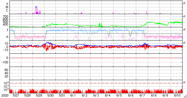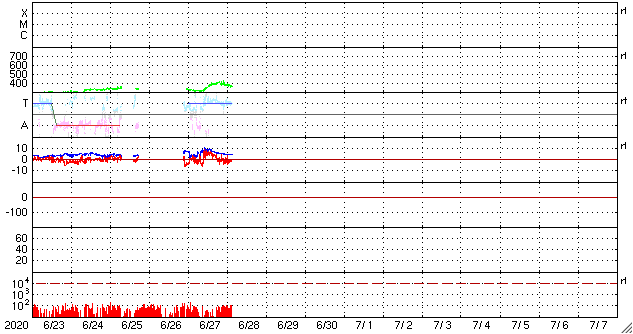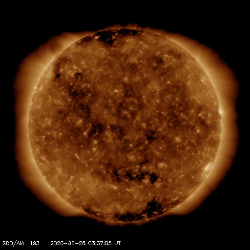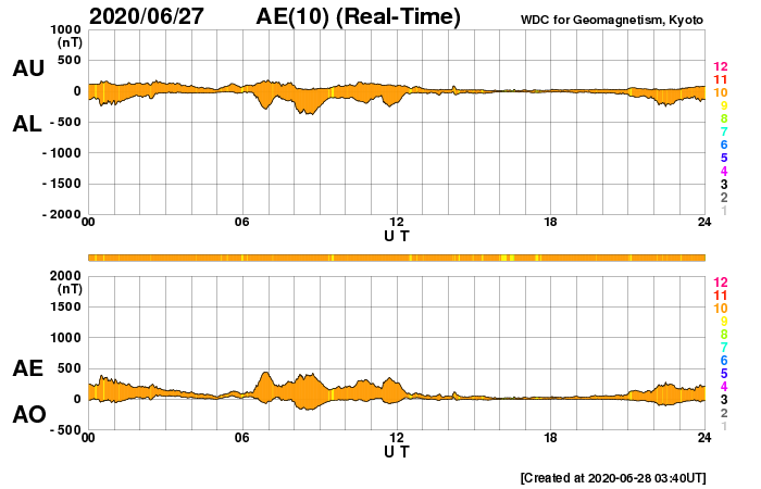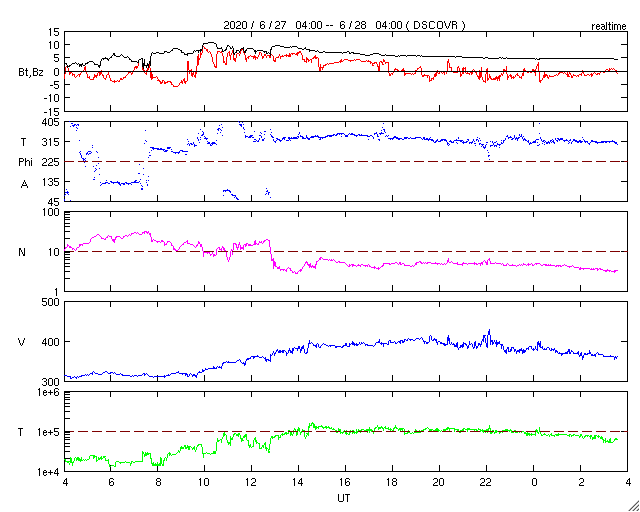 2020/ 6/28 12:46 更新 太陽風の速度が少し高まり、再び低速に戻っています。 担当 篠原 太陽風の速度は昨夜からゆっくりと上昇を始め、 今日未明に400km/秒と平均的な速さに達しています。 その後は少しずつ低下して、 現在は360km/秒と低速の状態に戻っています。 磁場強度は、速度が上がり始める頃に10nTへ高まりました。 その後は次第に低下して、5nTと平均的な状態に戻っています。 南北成分は、南向きに振れたり、北寄りになったりしています。 AE指数は、小規模の変化が度々発生しています。 太陽風の高まりは短い時間で終わりそうで、 太陽風は低速の穏やかな状態に戻りそうです。 太陽は、南半球に現れた小さい黒点が、 南西の端(右下)に近付いています。 X線グラフに特に変化はなく、太陽は穏やかです。 ![]() SDO衛星のAIA193カメラによる太陽コロナの様子 (c) SDO (NASA) ![]() SDO衛星による太陽の可視光写真。マウスの矢印を写真に重ねると、黒点番号付きの写真に切り替わります。 (c) SDO (NASA) ![]() DSCOVRが観測した太陽風の磁場(1番上の枠、黒線は全体の強度、赤線は南北成分) および、太陽風の密度(3番目の紫線)、速度(4番目の青線) (c) データ:NOAA/SWPC、作図:宇宙天気ニュース ![]() AE指数(速報値) 下段のAEグラフの値が高くなると、オーロラ活動が活発化しています。 (c) 京都大学WDC ![]() ![]() 27日の太陽周期に合わせたデータプロット 太陽が同じ面を地球に向けていた27日前の変化から、今後を予想することができます。 (c) 作図:宇宙天気ニュース