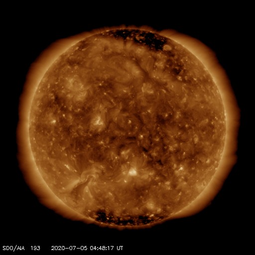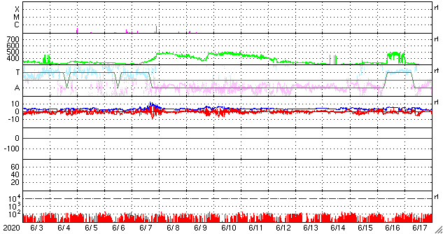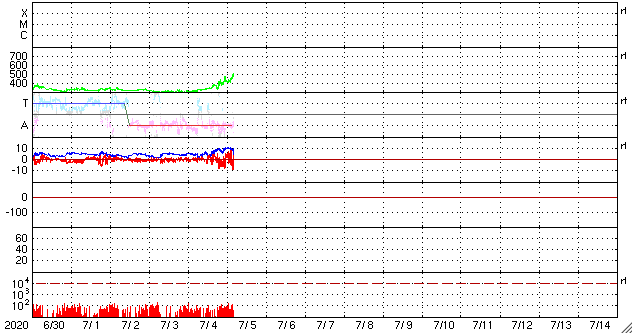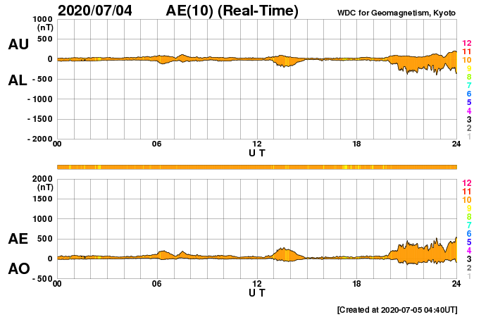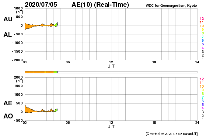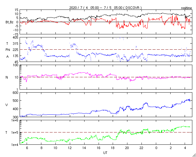 2020/ 7/ 5 13:58 更新 高速の太陽風が到来しています。太陽に小さい黒点が現れています。 担当 篠原 昨夜遅くから、太陽風の速度はゆっくりと上昇して、 グラフの最後でちょうど500km/秒に達し、 高速の状態になっています。 27日周期の図の前周期とほとんど同じタイミングで、 太陽風速度の変化が帰ってきました。 磁場強度は、速度が上がる頃に10nTに強まり、 現在は7nTへ少し下がっています。 磁場の南北成分は、振れ幅もやや強まって、 南北に変化しています。 AE指数は、磁場が南向きに振れた頃に、 500nTの変化が発生しています。 この後も、同様の変化が見られるかもしれません。 前周期の速度の高まりは、4日ほど続きました。 今回はどうなるでしょうか。 太陽では、赤道近くの東側(左側)に、 昨日の午後から黒点が現れ、 2766黒点群と番号が付けられています。 現れた位置は北緯6度と低く、古い第24期の黒点です。 X線グラフに変化はなく、活動は穏やかです。