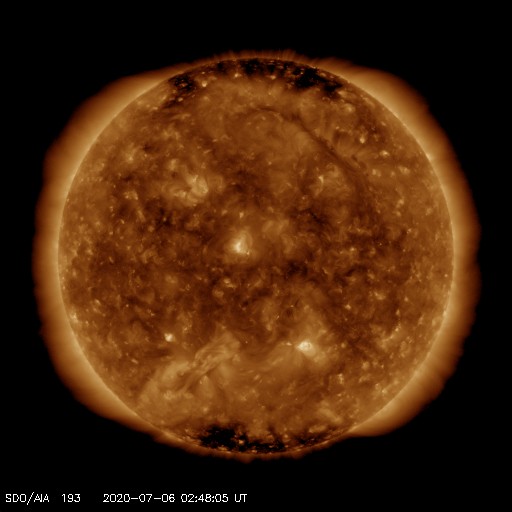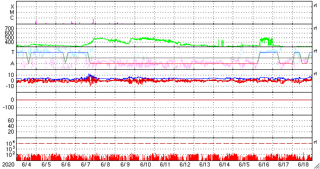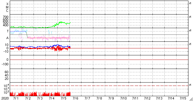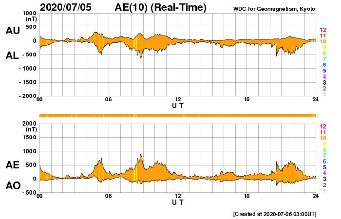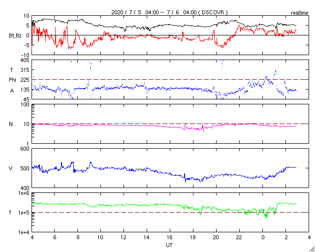 2020/ 7/ 6 12:03 更新 太陽風速度の高まりは続いています。黒点は小さくなっています。 担当 篠原 500km/秒に高まっていた太陽風の速度は、 今日未明に450km/秒へ少し下がりましたが、 グラフの最後で再び500km/秒に高まっています。 磁場強度は、5nT前後と平均的な状態です。 磁場の南北成分は、-5nT程度の南向きの変化があり、 AE指数に500〜800nTの中規模の変化が発生しています。 太陽風のグラフの最後では、 磁場は弱い北寄りになっていて、 この傾向が続くと、磁気圏は穏やかになるでしょう。 27日周期の図を見ると、 前周期の太陽風はもう3日ほど速度の高まりが続いています。 今回はどのくらいの期間になるでしょうか。 太陽では、2766黒点群の黒点は 昨日よりも小さくなっていて、 このまま消えてしまうかもしれません。 X線グラフに、 ゆっくりとした、強度の小さい高まりが起きています。 SDO衛星AIA193の画像を参照すると、 弱いフィラメント噴出か何かが起きている様です。 STEREO Ahead衛星の画像では、 淡いCME(コロナ質量放出)も飛び出しているようで、 3〜4日後くらいに影響がやって来るかもしれません。